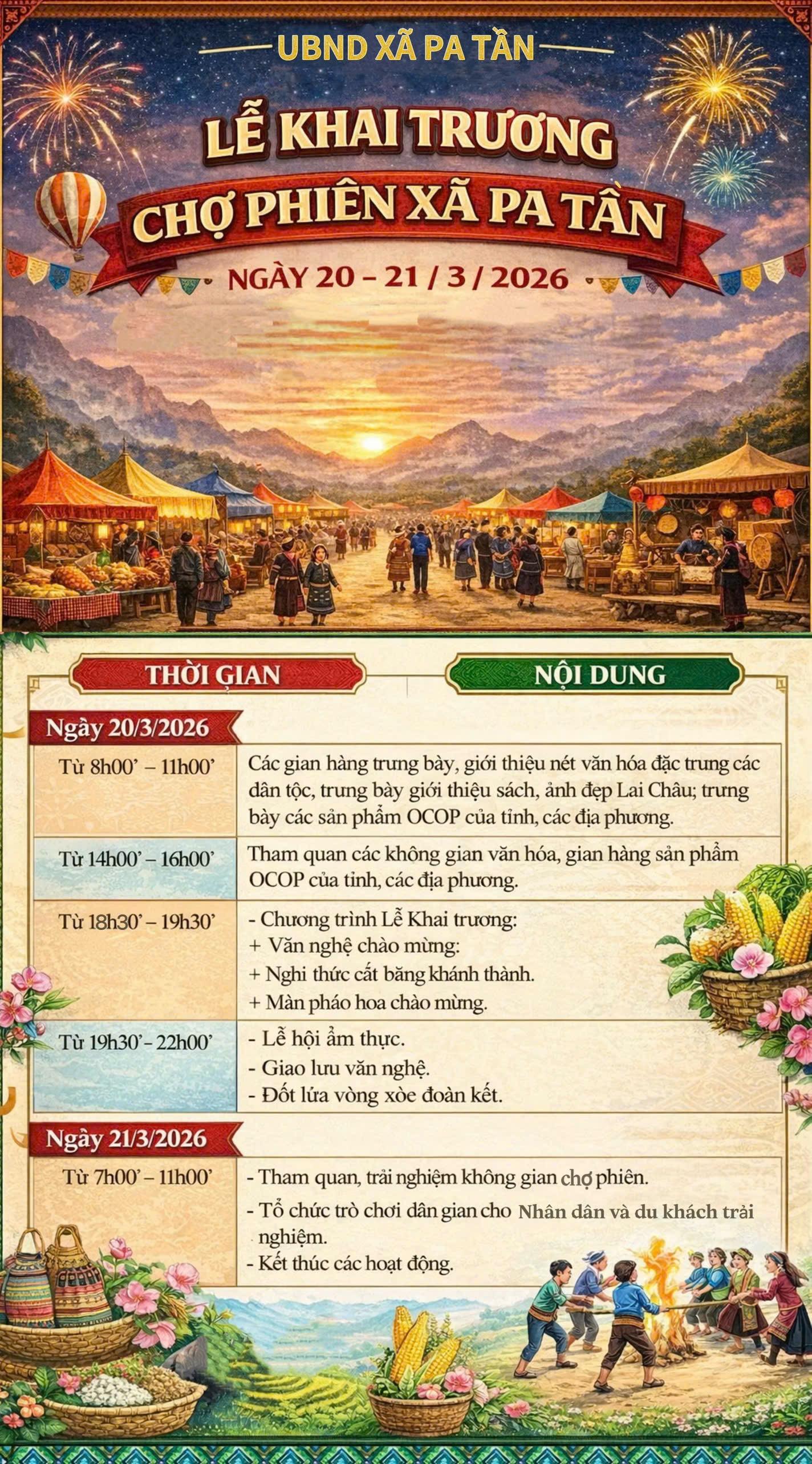 Trong 2 ngày 20–21/3, UBND xã Pa Tần tổ chức Lễ khai trương chợ phiên xã Pa Tần, mở ra không gian giao thương, quảng bá nông sản và gìn giữ bản sắc văn hóa các dân tộc địa phương, góp phần thúc đẩy phát triển kinh tế – xã hội trên địa bàn.