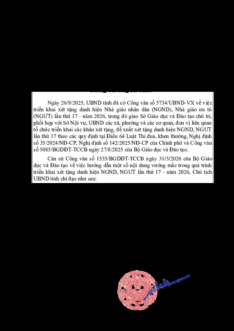 | Tiêu đề văn bản | Công văn V/v triển khai xét tặng danh hiệu NGND, NGƯT lần thứ 17 năm 2026 theo hướng dẫn của Bộ GD&ĐT | ||