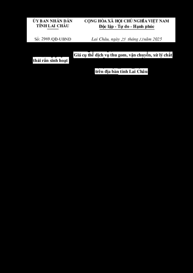 | Tiêu đề văn bản | Quyết định Ban hành quy định về Giá cụ thể dịch vụ thu gom, vận chuyển, xử lý chất thải rắn sinh hoạt đối với cơ quan, tổ chức, cơ sở sản xuất kinh doanh, dịch vụ, khu sản xuất, kinh doanh, dịch vụ tập trung, cụm công nghiệp, hộ gia đình, cá nhân trên địa bàn tỉnh Lai Châu | ||