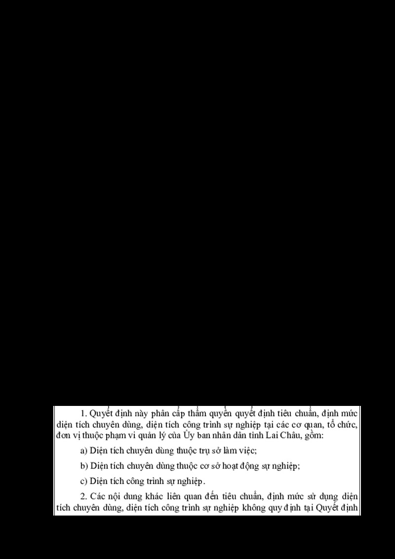 | Tiêu đề văn bản | Quyết định Phân cấp thẩm quyền quyết định tiêu chuẩn, định mức diện tích chuyên dùng, diện tích công trình sự nghiệp tại các cơ quan, tổ chức, đơn vị thuộc phạm vi quản lý của Ủy ban nhân dân tỉnh Lai Châu | ||