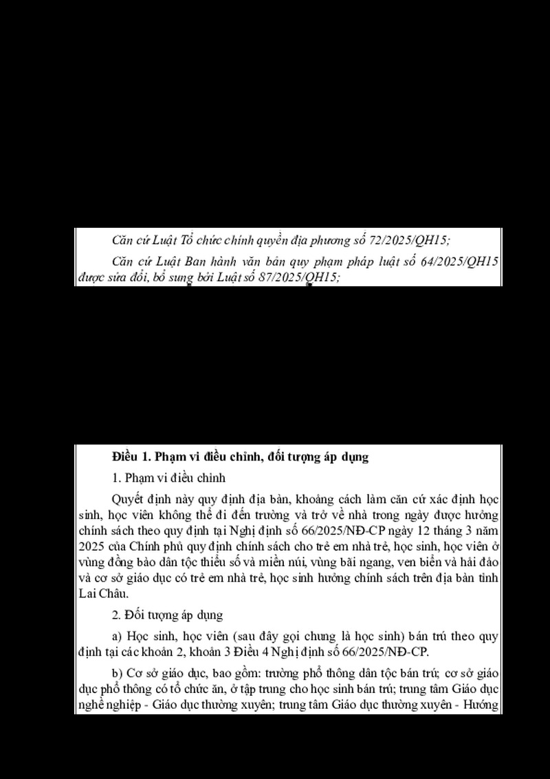 | Tiêu đề văn bản | Quyết định Quy định địa bàn, khoảng cách làm căn cứ xác định học sinh, học viên không thể đi đến trường và trở về nhà trong ngày được hưởng chính sách theo quy định tại Nghị định số 66/2025/NĐ-CP của Chính phủ trên địa bàn tỉnh Lai Châu | ||