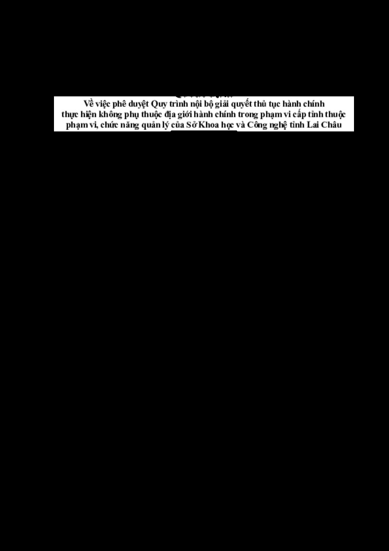 Tiêu đề văn bản | Quyết định Về việc phê duyệt Quy trình nội bộ giải quyết thủ tục hành chính thực hiện không phụ thuộc địa giới hành chính trong phạm vi cấp tỉnh thuộc phạm vi, chức năng quản lý của Sở Khoa học và Công nghệ tỉnh Lai Châu | ||