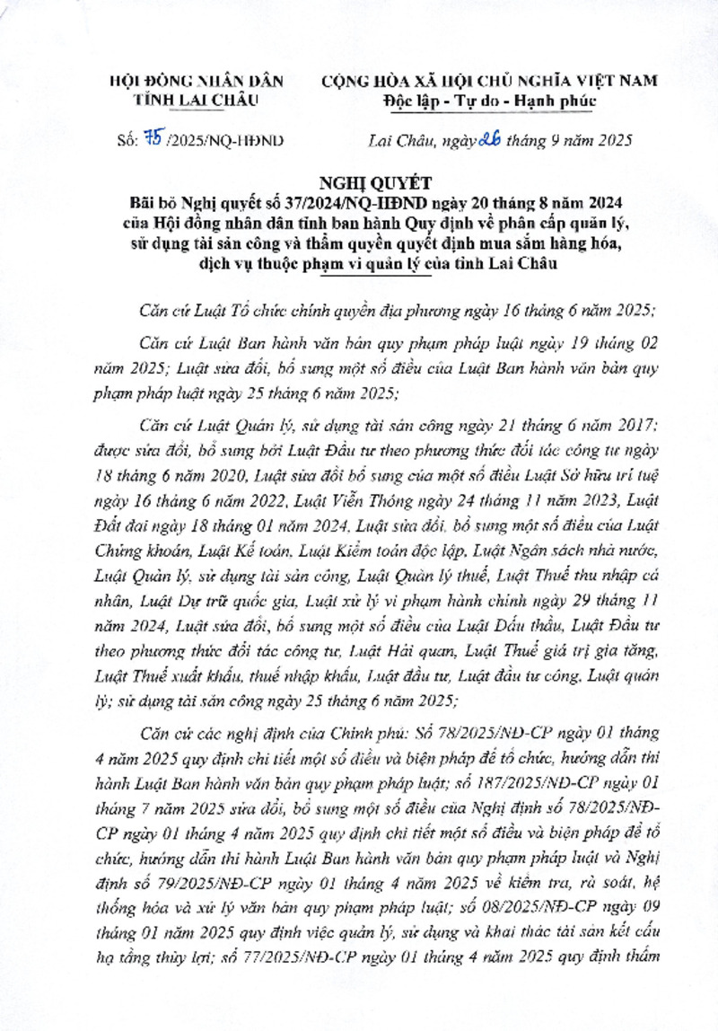 Tiêu đề văn bản | Nghị quyết Bãi bỏ Nghị quyết số 37/2024/NQ-HĐND ngày 20 tháng 8 năm 2024 của Hội đồng nhân dân tỉnh ban hành Quy định về phân cấp quản lý, sử dụng tài sản công và thẩm quyền quyết định mua sắm hàng hóa, dịch vụ thuộc phạm vi quản lý của tỉnh Lai Châu | ||