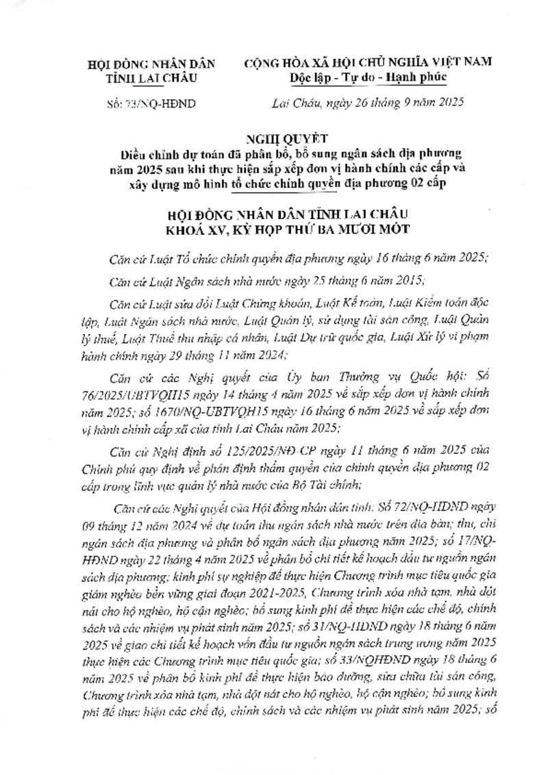 Tiêu đề văn bản | Nghị quyết Điều chỉnh dự toán đã phân bổ, bổ sung ngân sách địa phương năm 2025 sau khi thực hiện sắp xếp đơn vị hành chính các cấp và xây dựng mô hình tổ chức chính quyền địa phương 02 cấp | ||