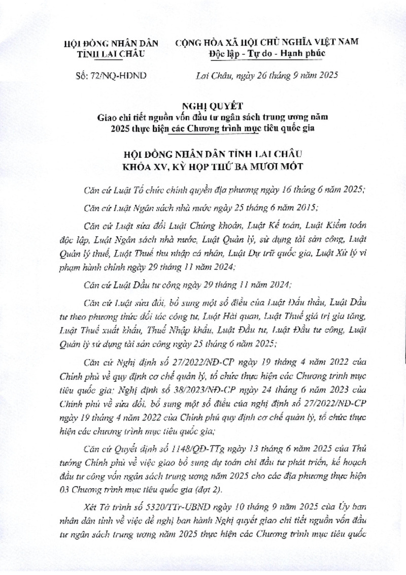 Tiêu đề văn bản | Nghị quyết Giao chi tiết nguồn vốn đầu tư ngân sách trung ương năm 2025 thực hiện các Chương trình mục tiêu quốc gia | ||