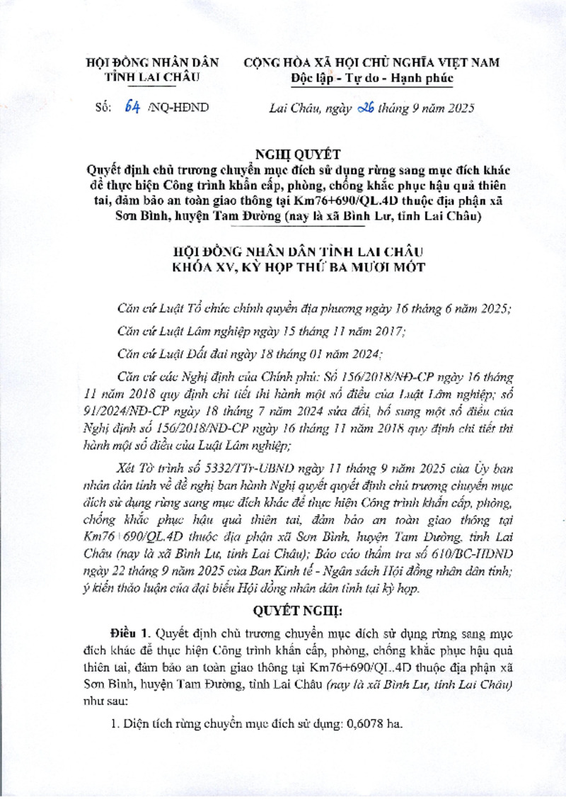 Tiêu đề văn bản | Nghị quyết Quyết định chủ trương chuyển mục đích sử dụng rừng sang mục đích khác để thực hiện Công trình khẩn cấp, phòng, chống khắc phục hậu quả thiên tai, đảm bảo an toàn giao thông tại Km76+690/QL.4D thuộc địa phận xã Sơn Bình, huyện Tam Đường (nay là xã Bình Lư, tỉnh Lai Châu) | ||
