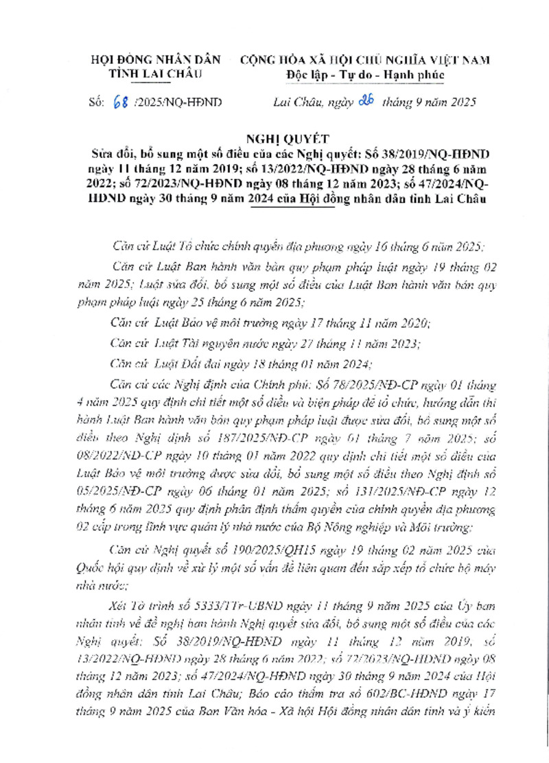 Tiêu đề văn bản | Nghị quyết Sửa đổi, bổ sung một số điều của các Nghị quyết: Số 38/2019/NQ-HĐND ngày 11 tháng 12 năm 2019; số 13/2022/NQ-HĐND ngày 28 tháng 6 năm 2022; số 72/2023/NQ- HĐND ngày 08 tháng 12 năm 2023; số 47/2024/NQ-HĐND ngày 30 tháng 9 năm 2024 của Hội đồng nhân dân tỉnh Lai Châu | ||