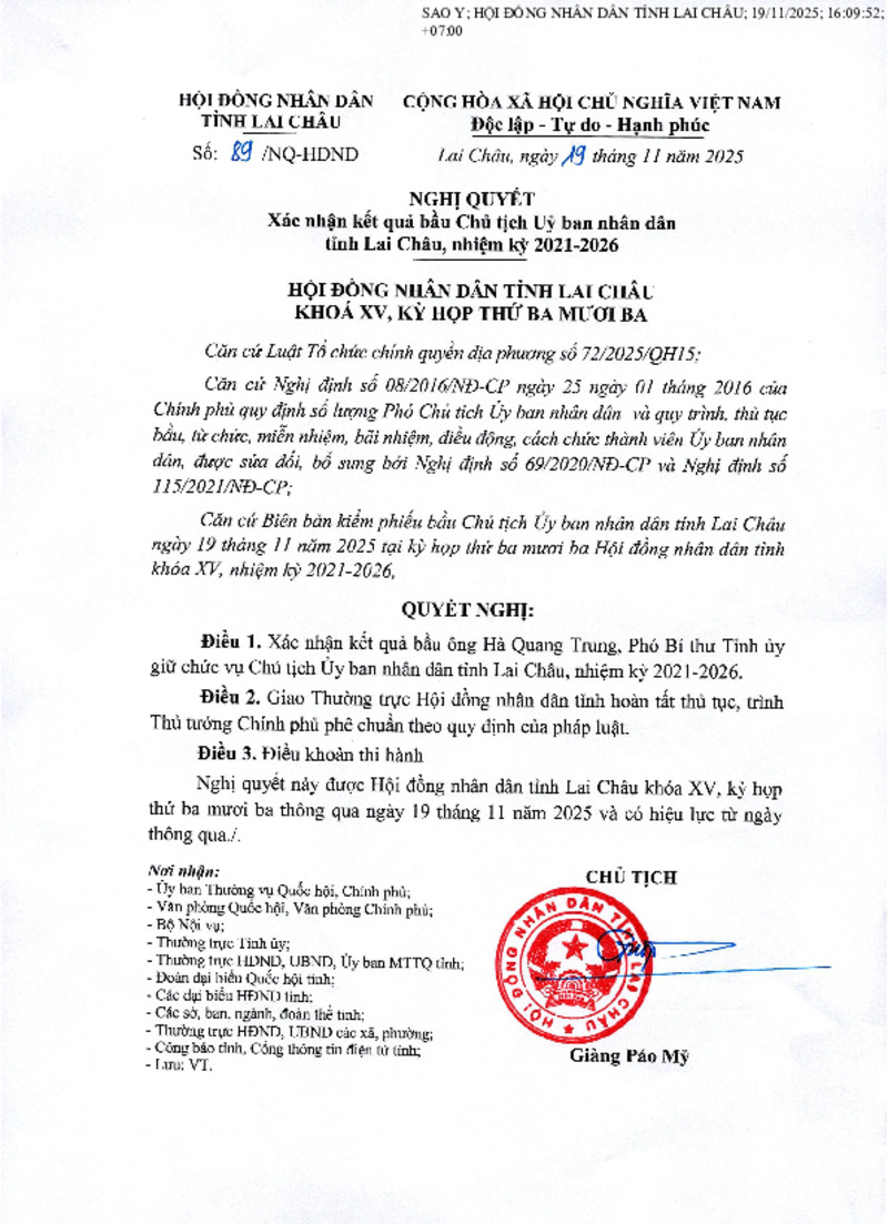 | Tiêu đề văn bản | Nghị quyết xác nhận kết quả bầu Chủ tịch Ủy ban nhân dân tỉnh Lai Châu, nhiệm kỳ 2021-2026 | ||