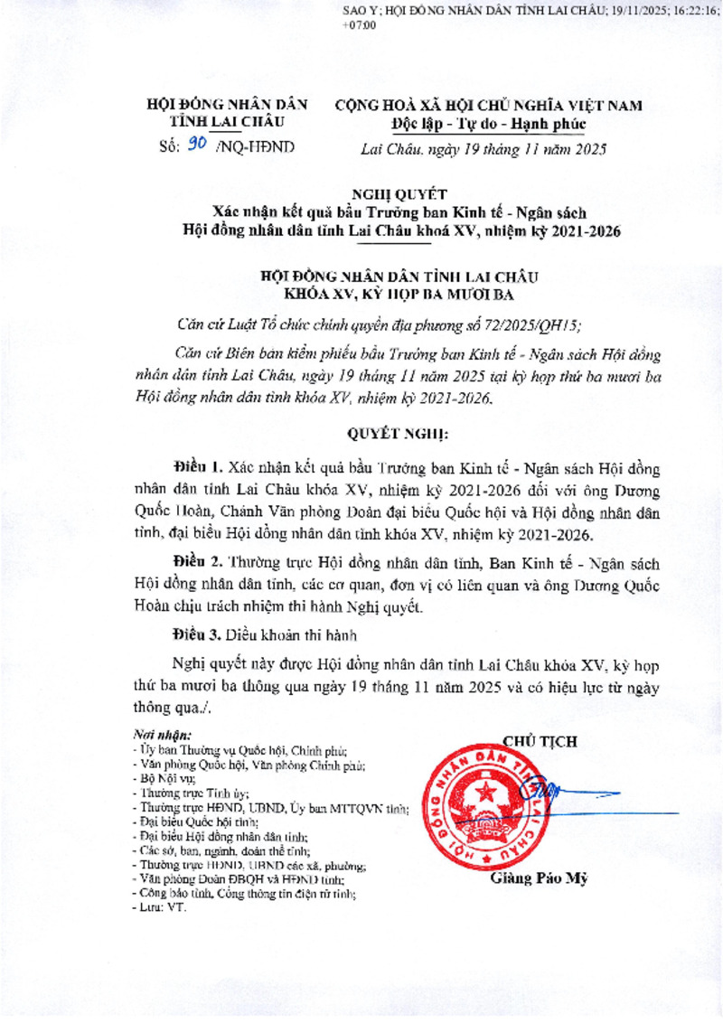 | Tiêu đề văn bản | Nghị quyết xác nhận kết quả bầu Trưởng ban Kinh tế - Ngân sách Hội đồng nhân dân tỉnh Lai Châu khóa XV, nhiệm kỳ 2021-2026 | ||