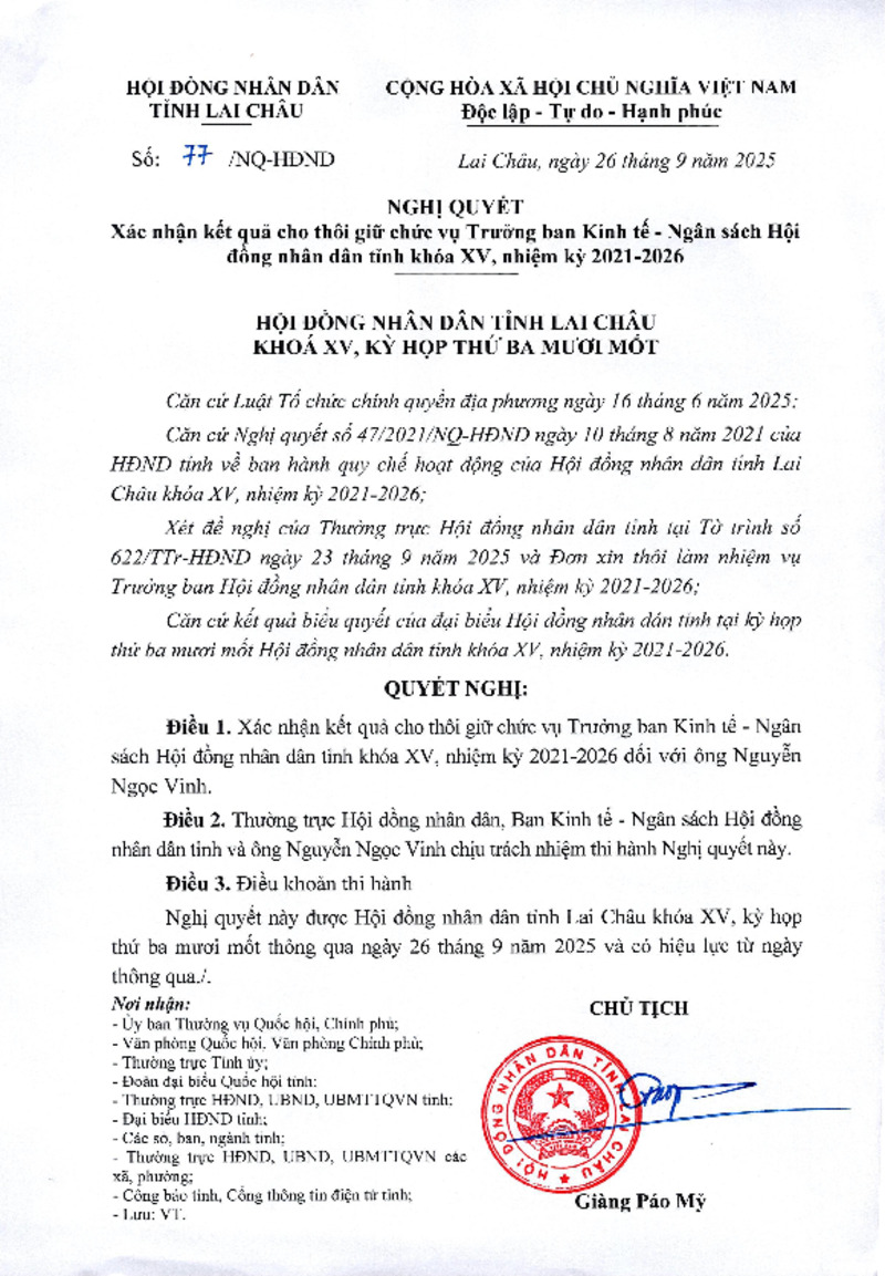 Tiêu đề văn bản | Nghị quyết Xác nhận kết quả cho thôi giữ chức vụ Trưởng Ban kinh tế - Ngân sách Hội đồng nhân dân tỉnh khóa XV, nhiệm kỳ 2021-2026 | ||