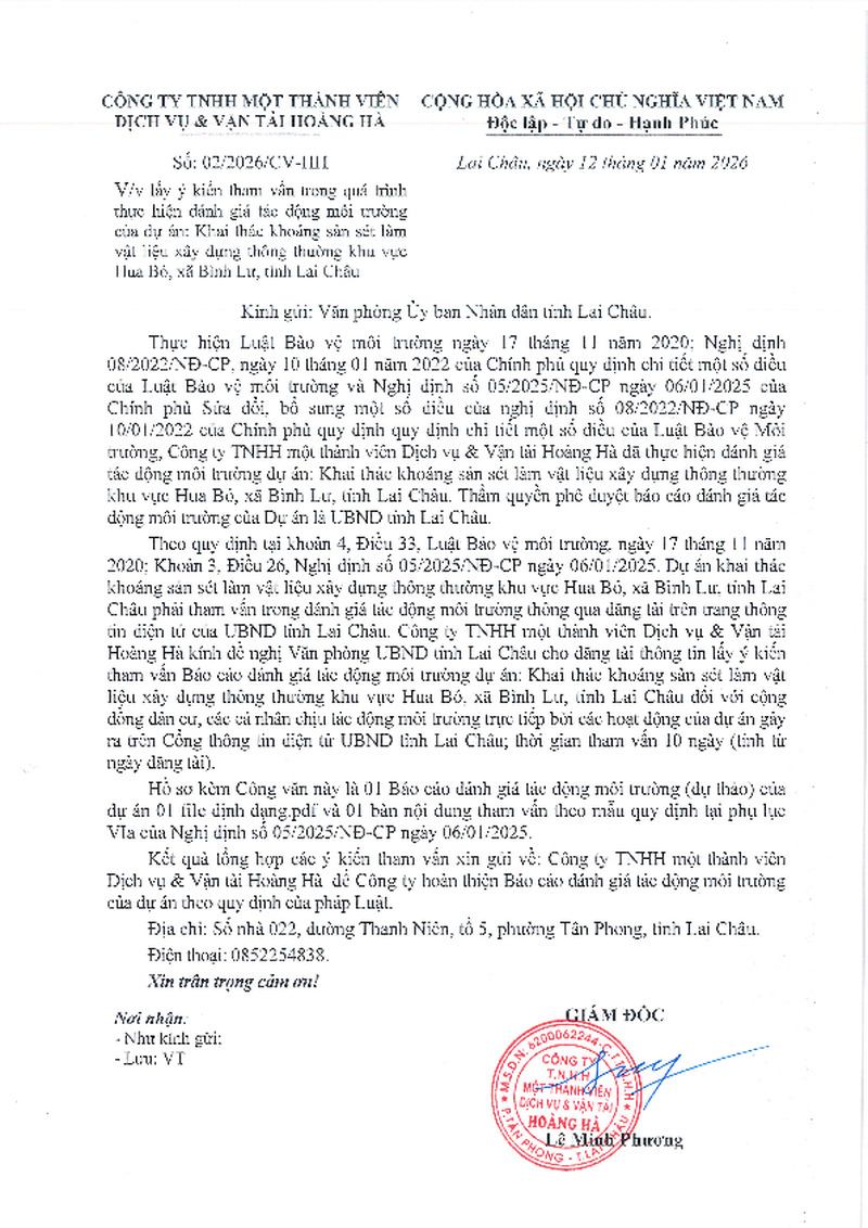 Lấy kiến tham vấn trong quá trình thực hiện đánh giá tác động môi trường của dự án: Khai thác khoáng sản sét làm vật liệu xây dựng thông thường khu vực Hua Bó, xã Bình Lư, tỉnh Lai Châu