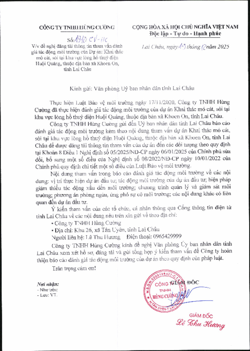Lấy ý kiến tham vấn Báo cáo đánh giá tác động môi trường dự án: Khai thác mỏ cát, sỏi tại khu vực lòng hồ thủy điện Huội Quảng, thuộc địa bàn xã Khoen On, tỉnh Lai Châu