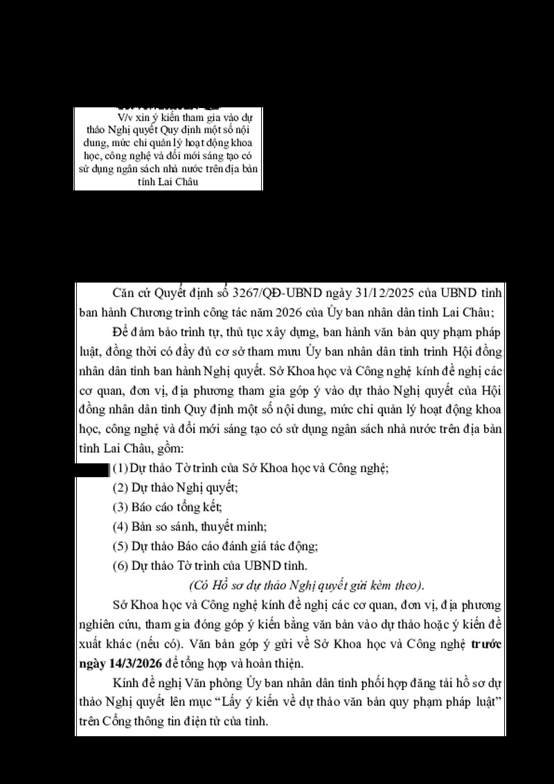 Lấy ý kiến vào dự thảo Nghị quyết Quy định một số nội dung, mức chi quản lý hoạt động khoa học, công nghệ và đổi mới sáng tạo có sử dụng ngân sách nhà nước trên địa bàn tỉnh Lai Châu