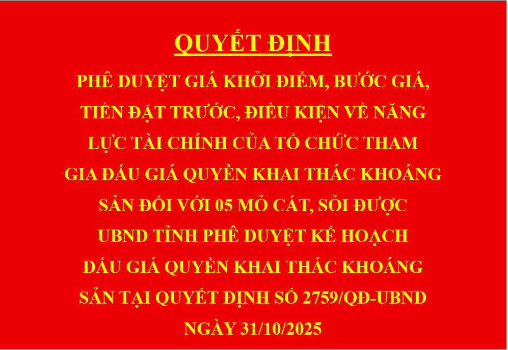 Quyết định Phê duyệt giá khởi điểm, bước giá, tiền đặt trước, điều kiện về năng lực tài chính của tổ chức tham gia đấu giá quyền khai thác khoáng sản đối với 05 mỏ cát, sỏi được UBND tỉnh phê duyệt Kế hoạch đấu giá quyền khai thác khoáng sản tại Quyết định số 2759/QĐ-UBND ngày 31/10/2025