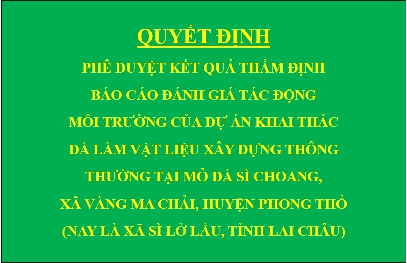 Quyết định Phê duyệt kết quả thẩm định báo cáo đánh giá tác động môi trường của Dự án Khai thác đá làm vật liệu xây dựng thông thường tại mỏ đá Sì Choang, xã Vàng Ma Chải, huyện Phong Thổ (nay là xã Sì Lở Lầu, tỉnh Lai Châu)