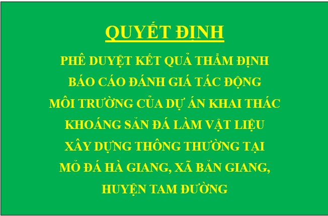 Quyết định Phê duyệt kết quả thẩm định báo cáo đánh giá tác động môi trường của Dự án Khai thác khoáng sản đá làm vật liệu xây dựng thông thường tại mỏ đá Hà Giang, xã Bản Giang, huyện Tam Đường.
