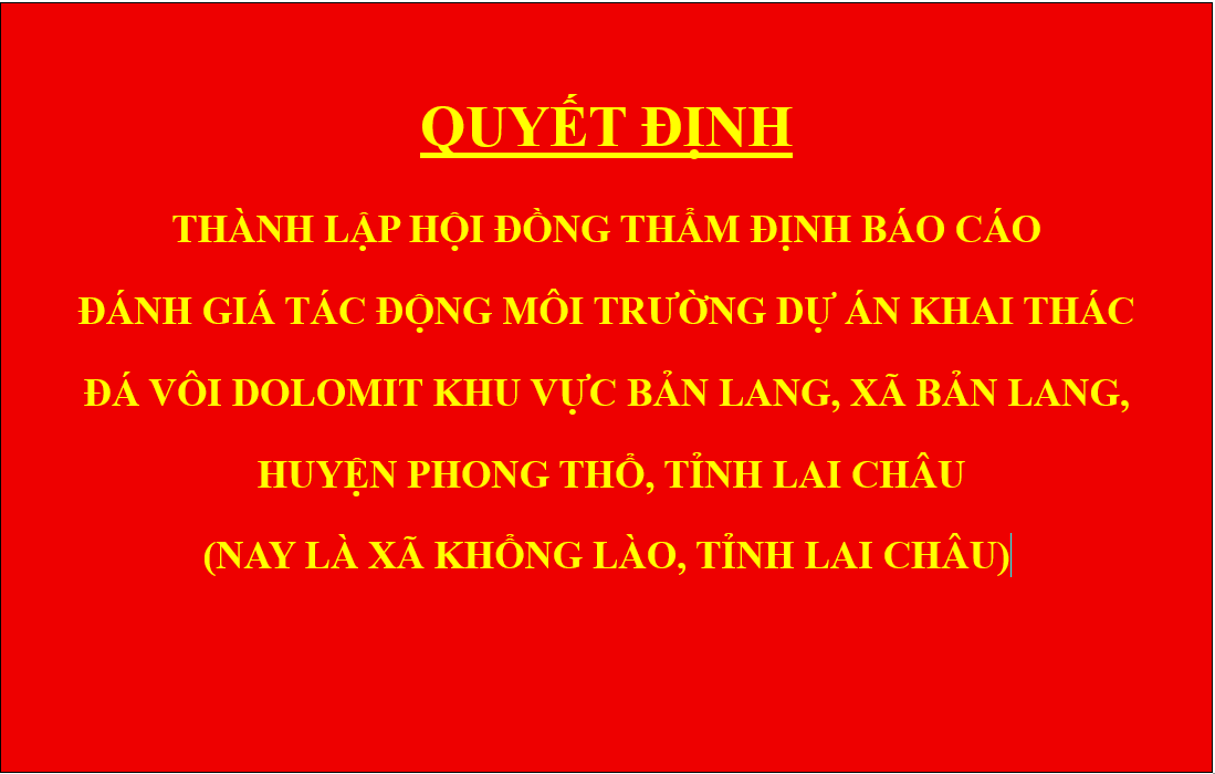Quyết định Thành lập hội đồng thẩm định báo cáo đánh giá tác động môi trường dự án Khai thác đá vôi dolomit khu vực Bản Lang, xã Bản Lang, huyện Phong Thổ, tỉnh Lai Châu (nay là xã Khổng Lào, tỉnh Lai Châu)