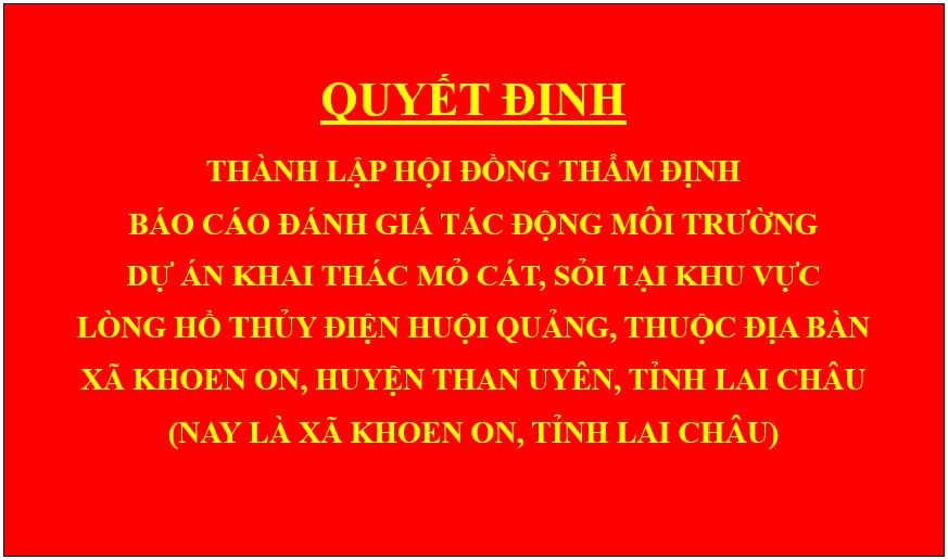 Quyết định Thành lập Hội đồng thẩm định báo cáo đánh giá tác động môi trường dự án Khai thác mỏ cát, sỏi tại khu vực lòng hồ thủy điện Huội Quảng, thuộc địa bàn xã Khoen On, huyện Than Uyên, tỉnh Lai Châu (nay là xã Khoen On, tỉnh Lai Châu)