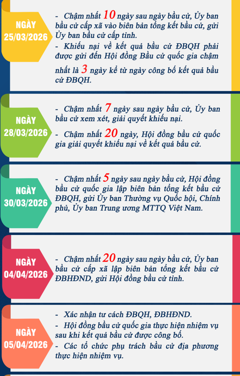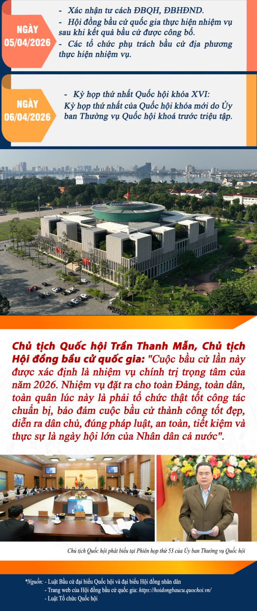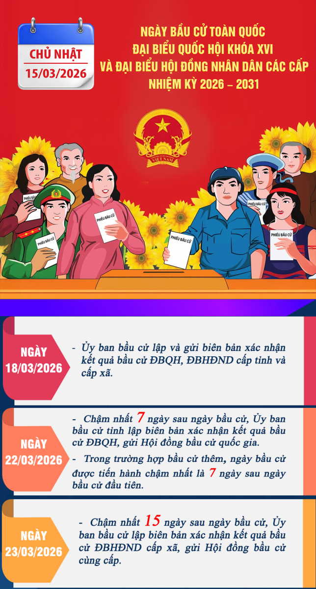 Ngày 15/3/2026 - Ngày bầu cử toàn quốc đại biểu Quốc hội khóa XVI và đại biểu Hội đồng nhân dân các cấp, nhiệm kỳ 2026-2031 đã được tổ chức thành công với trên 76 triệu cử tri cả nước đã tham gia bỏ phiếu, đạt tỷ lệ 99,68% (tính đến 23 giờ 00). Sau bầu cử, Hội đồng Bầu cử Quốc gia và Ủy ban Bầu cử các địa phương tiếp tục triển khai nhiều công việc quan trọng để hoàn tất quy trình bầu cử theo đúng quy định của pháp luật, đảm bảo kết quả phản ánh trung thực ý chí và nguyện vọng của cử tri. Cổng Thông tin điện tử Quốc hội giới thiệu một số mốc thời gian quan trọng sau ngày bầu cử 15/3.