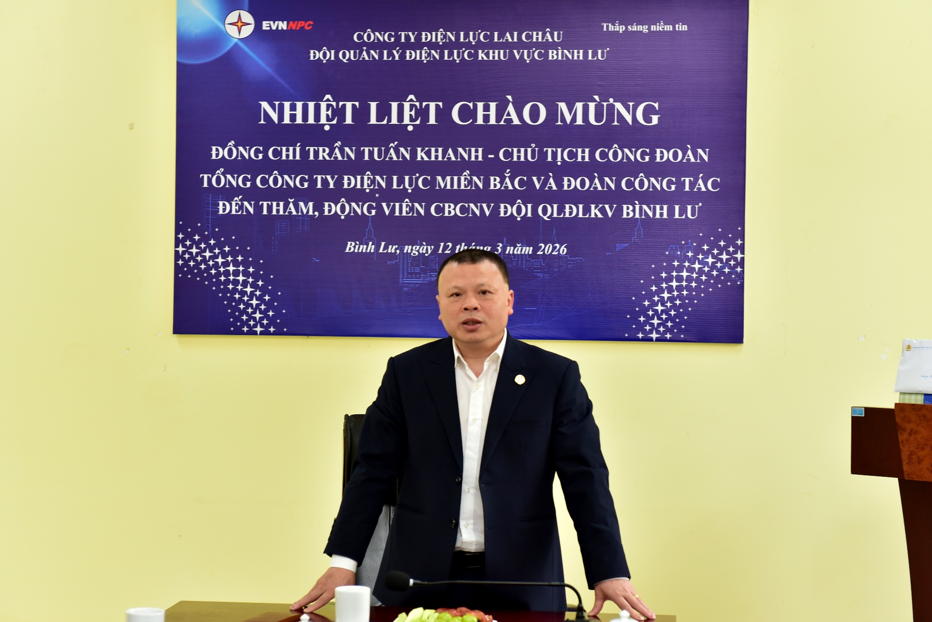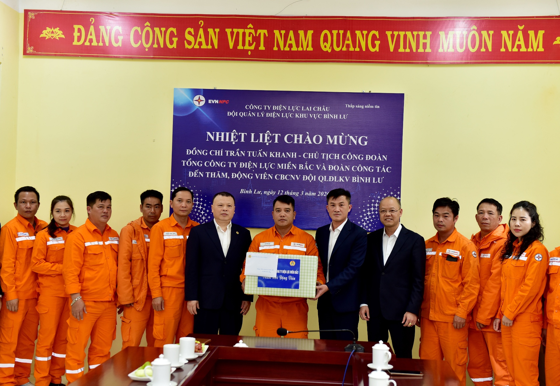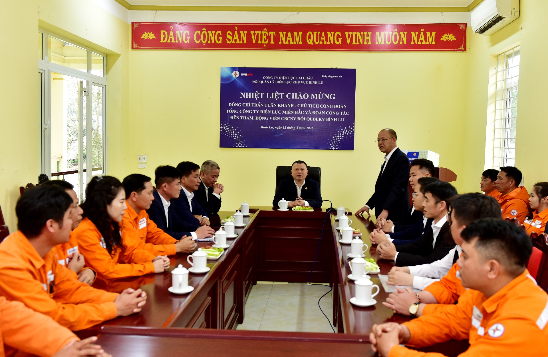 Chiều 12/3, Đoàn công tác của Công đoàn Tổng Công ty Điện lực miền Bắc do đồng chí Trần Tuấn Khanh – Chủ tịch Công đoàn Tổng Công ty Điện lực miền Bắc làm trưởng đoàn đã đến thăm, động viên Đội Quản lý Điện lực khu vực (QLĐLKV) Bình Lư và một số tổ trực đảm bảo cấp điện phục vụ bầu cử đại biểu Quốc hội khóa XVI và đại biểu HĐND các cấp nhiệm kỳ 2026 – 2031. Cùng đi với đoàn có đồng chí Trần Kim Long – Giám đốc Công ty Điện lực Lai Châu cùng các đồng chí trong Ban Giám đốc và lãnh đạo các phòng, ban trực thuộc.