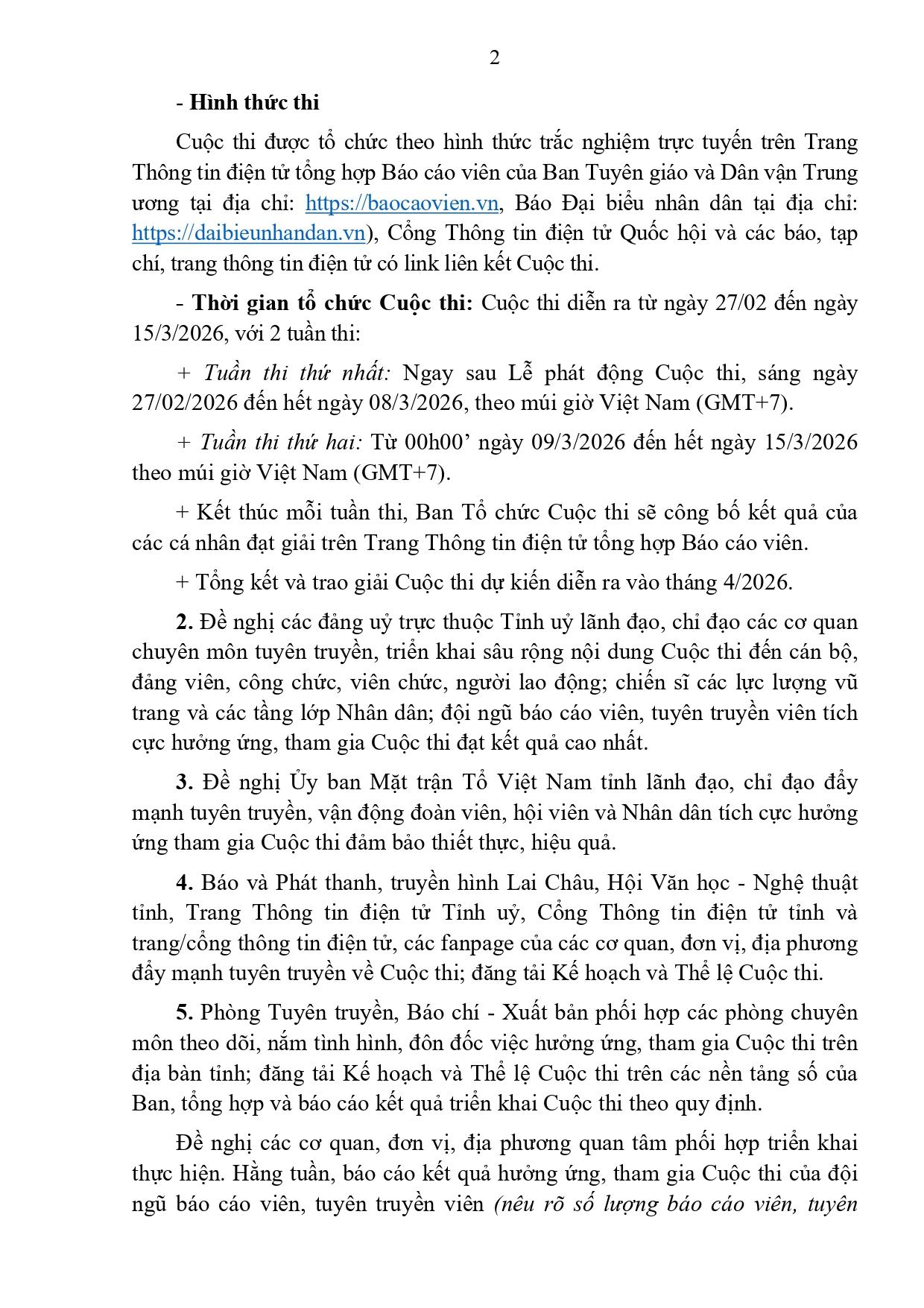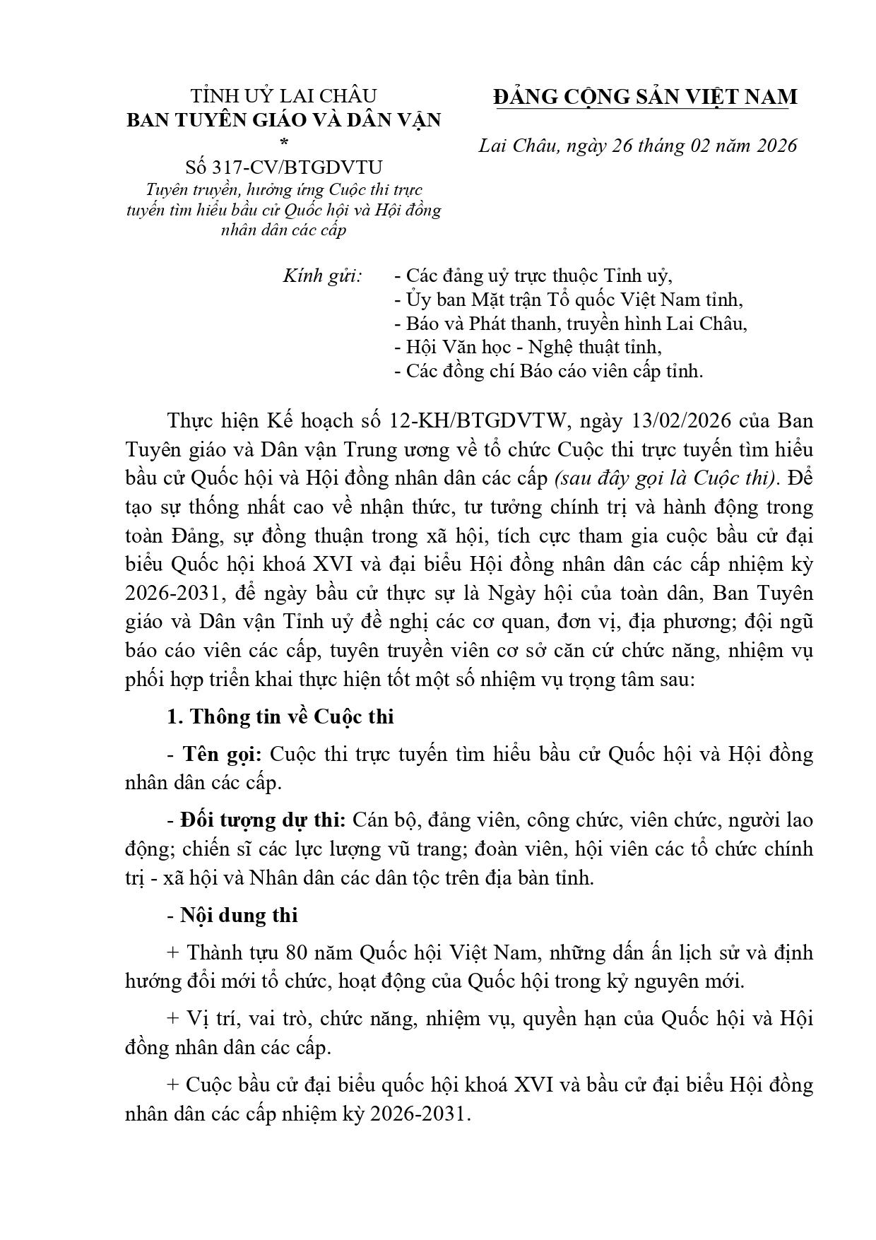 Ban Tuyên giáo và Dân vận Tỉnh ủy Lai Châu vừa ban hành Kế hoạch Số 317-CV/BTGDVTU, ngày 26/2/2026 về Tuyên truyền, hưởng ứng Cuộc thi trực tuyến tìm hiểu bầu cử Quốc hội và Hội đồng nhân dân các cấp.
