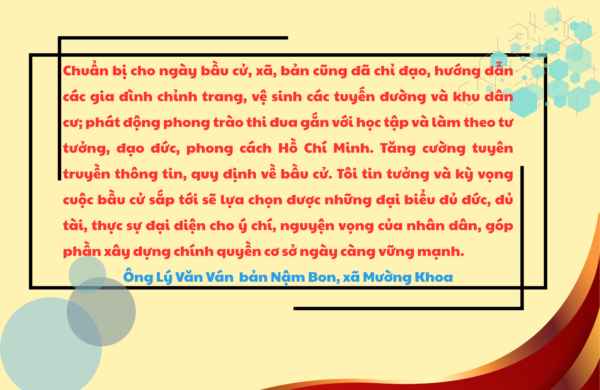 Theo ông Phan Văn Cương - Chủ tịch Ủy ban MTTQ Việt Nam xã Mường Khoa, công tác chuẩn bị bầu cử trên địa bàn xã được triển khai đúng tiến độ, bảo đảm dân chủ, công khai và quy định pháp luật. Các nhiệm vụ trọng tâm như: kiện toàn Ủy ban Bầu cử xã, xây dựng kế hoạch tổ chức bầu cử, thành lập các tổ bầu cử, thực hiện quy trình hiệp thương, tiếp nhận hồ sơ ứng cử, rà soát, lập danh sách cử tri và chuẩn bị cơ sở vật chất tại các khu vực bỏ phiếu đều được triển khai nghiêm túc, chặt chẽ. Công tác tuyên truyền được thực hiện linh hoạt, phù hợp với điều kiện thực tế của địa phương, góp phần nâng cao nhận thức, trách nhiệm của cử tri; các lực lượng chức năng chủ động bảo đảm an ninh chính trị, trật tự an toàn xã hội, không để phát sinh các vấn đề phức tạp liên quan đến bầu cử. Thời gian tới, xã Mường Khoa sẽ tiếp tục triển khai các bước tiếp theo theo đúng lộ trình, phấn đấu tổ chức thành công cuộc bầu cử, để ngày bầu cử thực sự trở thành ngày hội của toàn dân.