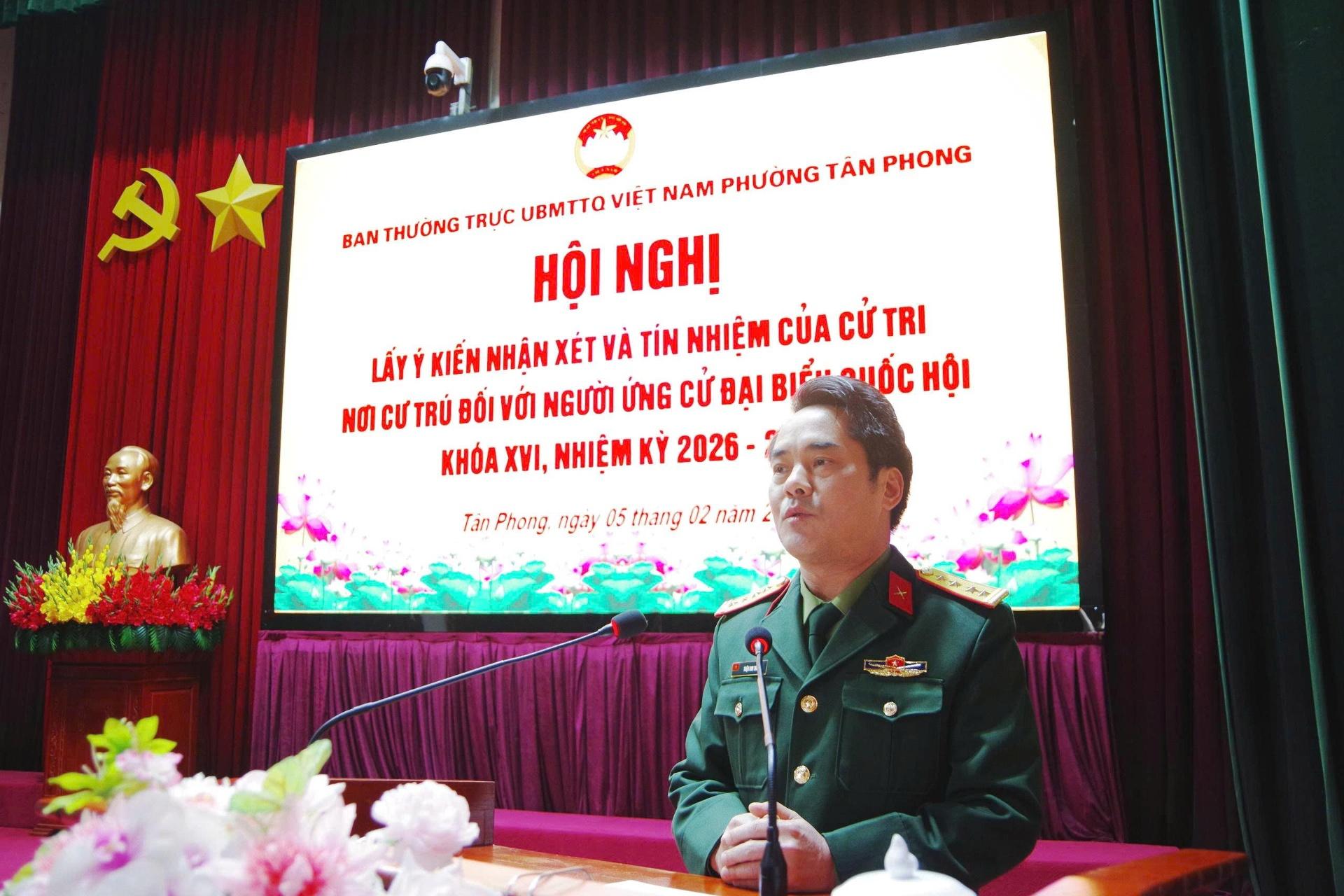 Chiều 5/2, tại Bộ Chỉ huy Quân sự (CHQS) tỉnh Lai Châu, Ban Thường trực Ủy ban Mặt trận Tổ quốc Việt Nam phường Tân Phong tổ chức Hội nghị lấy ý kiến nhận xét và tín nhiệm của cử tri nơi cư trú đối với người ứng cử đại biểu Quốc hội khóa XVI và đại biểu HĐND các cấp, nhiệm kỳ 2026-2031.