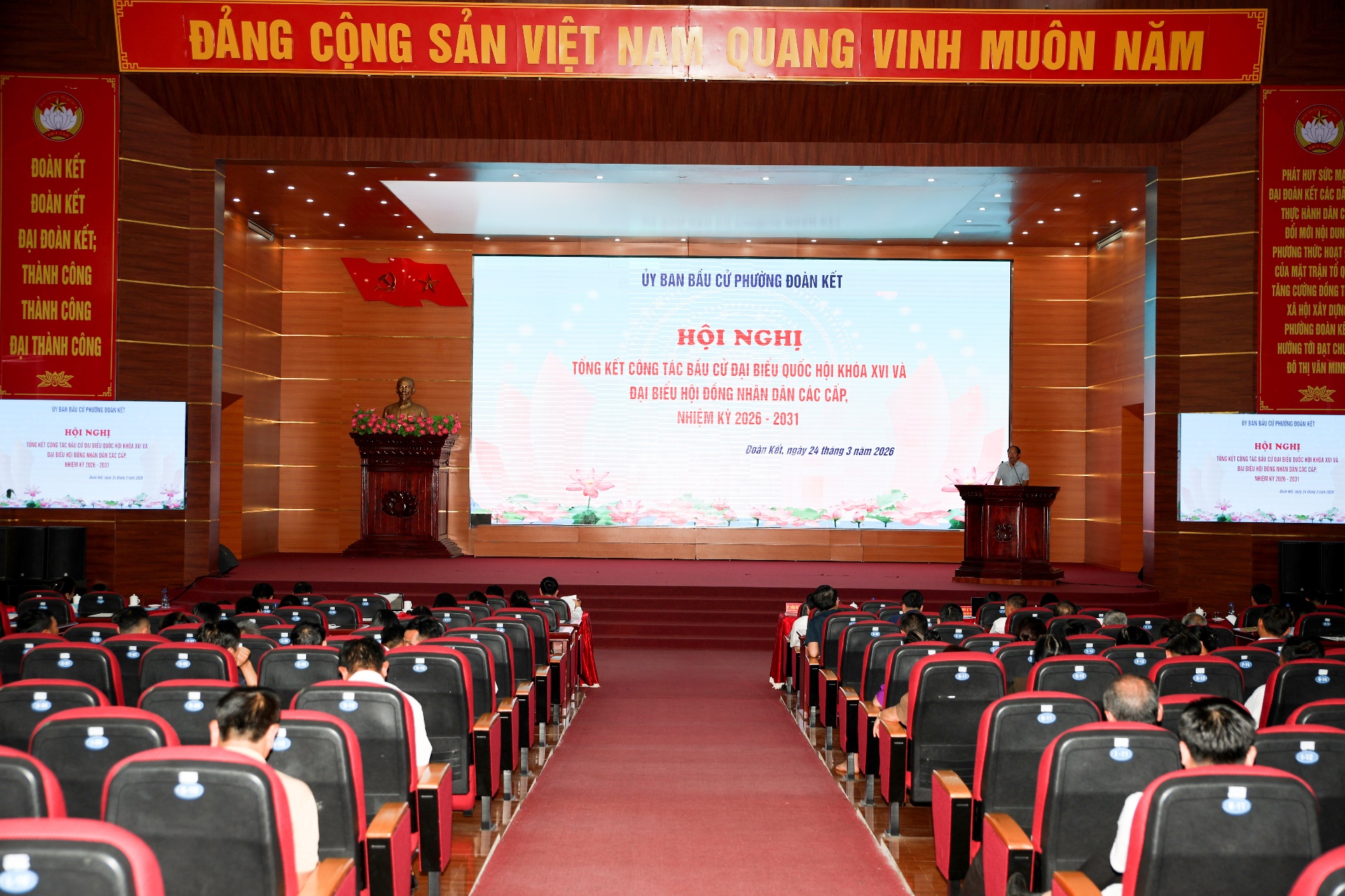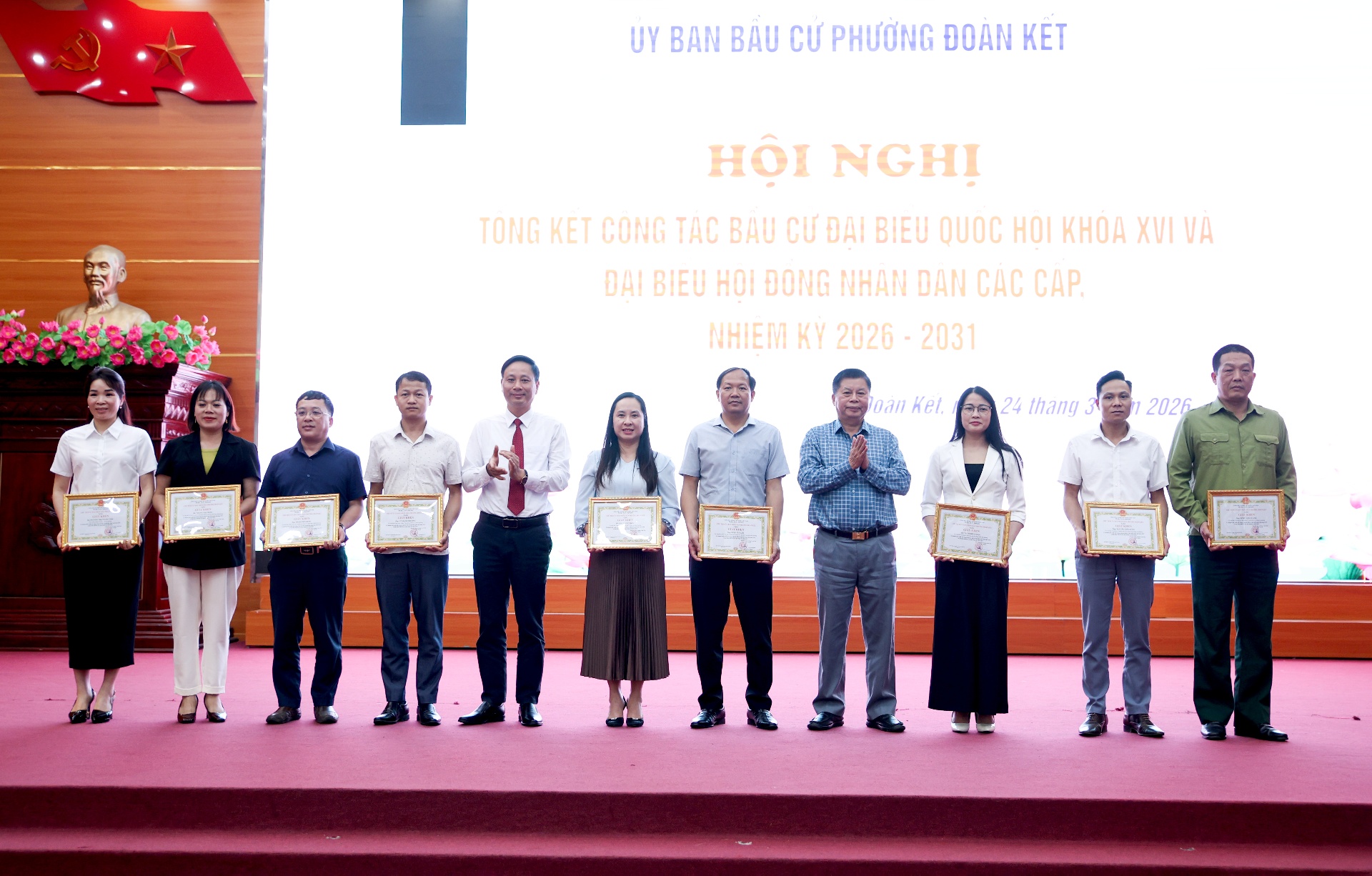 Chiều 24/3, Ủy ban Bầu cử phường Đoàn Kết tổ chức Hội nghị tổng kết công tác bầu cử đại biểu Quốc hội và đại biểu HĐND các cấp nhiệm kỳ 2026-2031. Dự hội nghị có các đồng chí lãnh đạo Đảng ủy, HĐND, UBND, Ủy ban MTTQ Việt Nam phường; thành viên ủy ban bầu cử, ban bầu cử, tổ giúp việc Ủy ban bầu cử; bí thư chi bộ, tổ trưởng, trưởng ban công tác mặt trận các Tổ dân phố trên địa bàn, tập thể, cá nhân được khen thưởng...