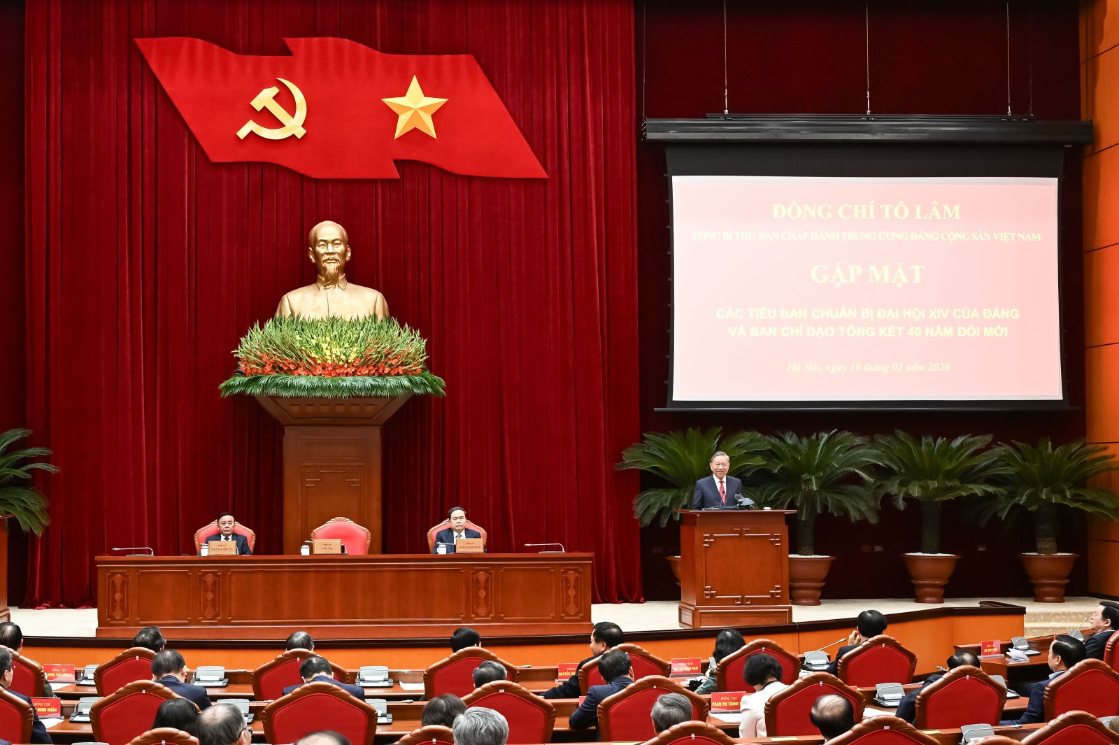 Chiều 10/2/2026, Tổng Bí thư Tô Lâm chủ trì gặp mặt thành viên các Tiểu ban chuẩn bị Đại hội XIV của Đảng và thành viên Ban Chỉ đạo Tổng kết một số vấn đề lý luận và thực tiễn về công cuộc đổi mới theo định hướng xã hội chủ nghĩa 40 năm qua ở Việt Nam (Ban Chỉ đạo Tổng kết 40 năm đổi mới).