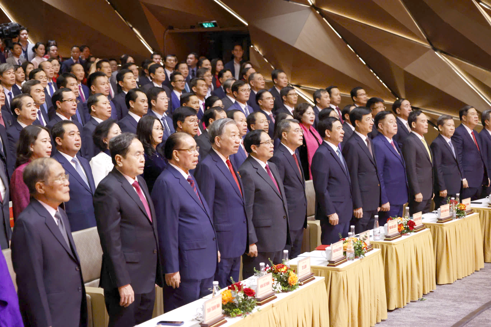 Cùng dự có các đồng chí: Nguyên Tổng Bí thư Nông Đức Mạnh; Ủy viên Bộ Chính trị khóa XIII, Thủ tướng Chính phủ Phạm Minh Chính; Ủy viên Bộ Chính trị, Chủ tịch Quốc hội Trần Thanh Mẫn; nguyên Ủy viên Bộ Chính trị, nguyên Chủ tịch Quốc hội: Nguyễn Sinh Hùng, Nguyễn Thị Kim Ngân; Ủy viên Bộ Chính trị, Thường trực Ban Bí thư Trần Cẩm Tú; Ủy viên Bộ Chính trị, Bí thư Trung ương Đảng, Trưởng ban Tổ chức Trung ương Lê Minh Hưng, Trưởng Ban Chỉ đạo Giải Búa liềm Vàng.