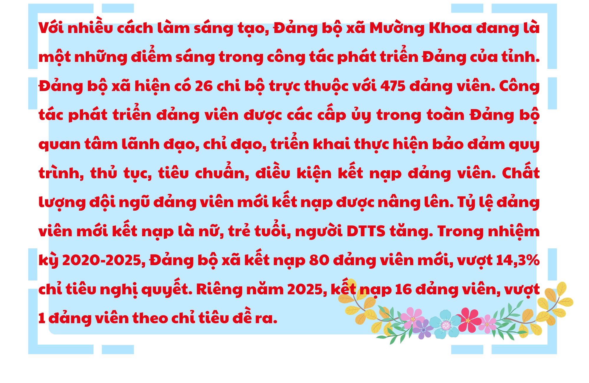 Nhìn lại kết quả đạt được, công tác phát triển đảng viên trong năm 2025 của Đảng bộ tỉnh không chỉ đạt và vượt chỉ tiêu về số lượng, mà quan trọng hơn là nâng cao về chất. Nhiều mô hình, cách làm sáng tạo được triển khai, tạo nguồn đảng viên từ học sinh THPT, thanh niên, công nhân, đồng bào DTTS... Những nỗ lực ấy góp phần củng cố tổ chức Đảng ở cơ sở, tạo thêm sức mạnh đoàn kết trong toàn dân và bổ sung nguồn lực mới cho đảng.