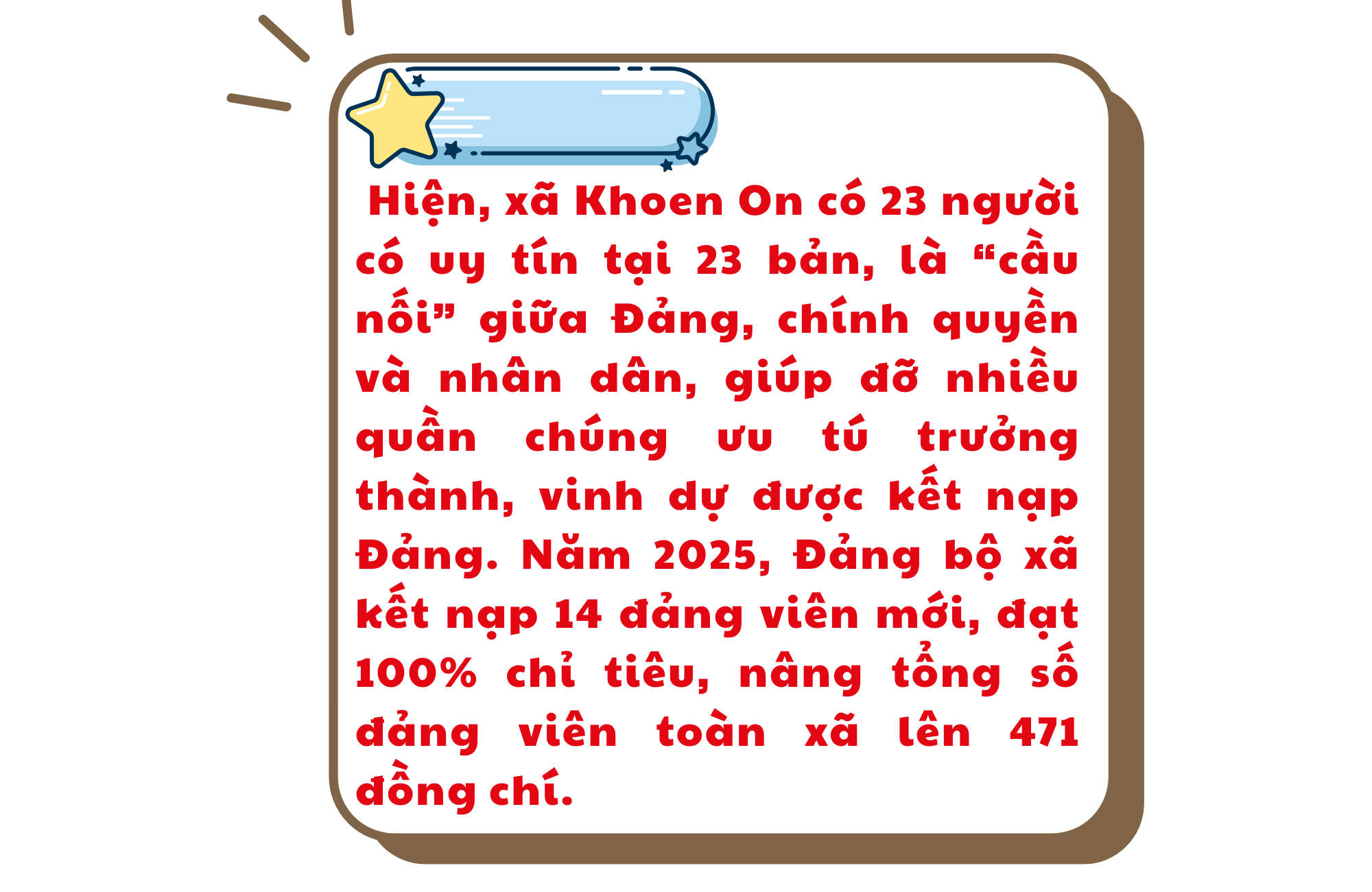Đảng ủy xã Khoen On cũng quan tâm phát huy hiệu quả vai trò của người có uy tín trong công tác phát triển đảng viên. Đây là đội ngũ uy tín am hiểu phong tục, có ảnh hưởng trong cộng đồng, được nhân dân tin tưởng, sẽ nâng cao hiệu quả tuyên truyền, vận động. Hiện, toàn xã có 23 người có uy tín tại 23 bản, là “cầu nối” giữa Đảng, chính quyền và nhân dân, giúp đỡ nhiều quần chúng ưu tú trưởng thành, vinh dự được kết nạp Đảng. Năm 2025, Đảng bộ xã kết nạp 14 đảng viên mới, đạt 100% chỉ tiêu, nâng tổng số đảng viên toàn xã lên 471 đồng chí.