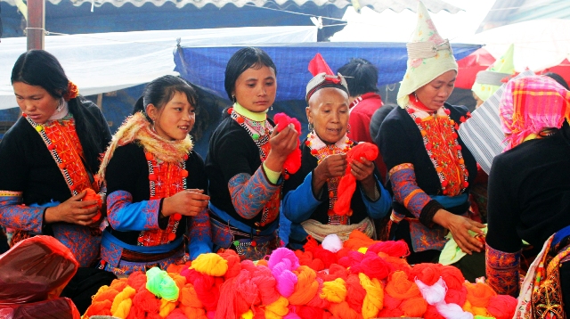 ![]() Phụ nữ Dao đỏ mua chỉ về may trang phục. Nguồn internet. |