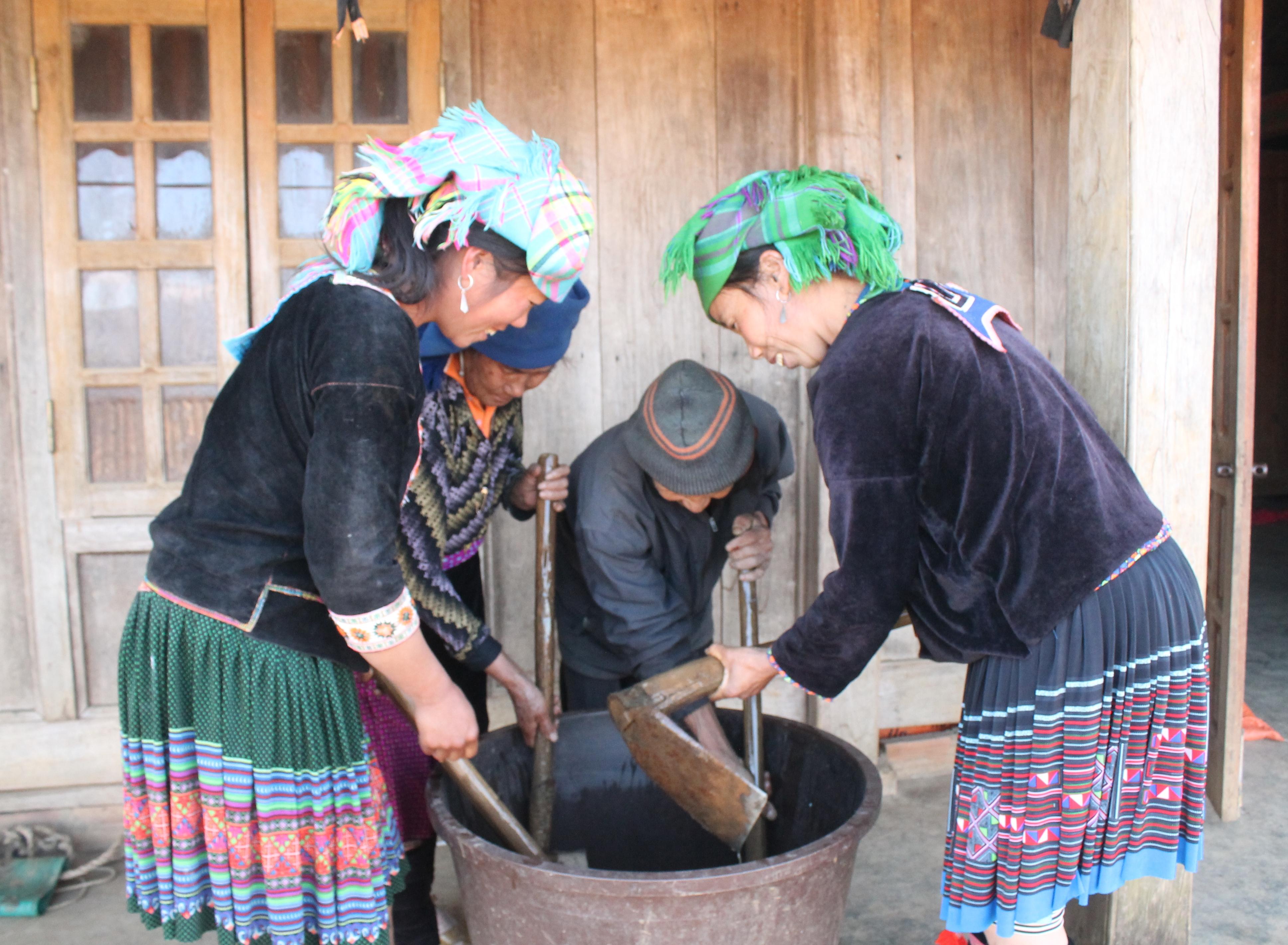 Ngày Tết, một việc không thể thiếu của bà con mổ lợn lấy thịt gói bánh, làm thức ăn trong những ngày tết. Không kể gia cảnh, nhà nào cũng làm vài mâm cỗ mời anh em, hàng xóm đến chung vui nhằm tổng kết năm cũ, chào đón năm mới. Bắt đầu từ ngày 29/12 (âm lịch), bà con làm bánh dày - món bánh truyền thống của bào dân tộc Mông Sin Suối Hồ nói riêng và đồng bào Mông ở Lai Châu nói chung. Nguyên liệu làm bánh dày được các mẹ, các chị lựa chọn ngay từ khi thu hoạch lúa, bông nào chắc hạt mẩy, đều hạt đem để dành riêng cho việc làm bánh. Thóc sau đó mang lúa đi sát, ngâm gạo, đồ 2 lần cho xôi thật mềm chín đều mà không bị nhão. Sau đó, đem ra cối giã nhuyễn, mẻ bánh đầu tiên bà con thường làm to để dâng lên cúng tổ tiên vào đêm giao thừa. Để chuẩn bị mâm cúng tổ tiên, ngoài bánh dày, bà con còn chuẩn bị 1 con gà trống, 2 chén rượu, 2 bát nước, thịt lợn luộc và một số nông cụ sản xuất, đồ dùng sinh hoạt đã sử dụng trong năm cũ như: cuốc, xẻng, dao phát, thớt, bát…đem rửa sạch từ trước tết, dán giấy đặt gần bàn thờ để chiều hoặc tối 30 mời trưởng dòng họ đến cúng cho gia đình.