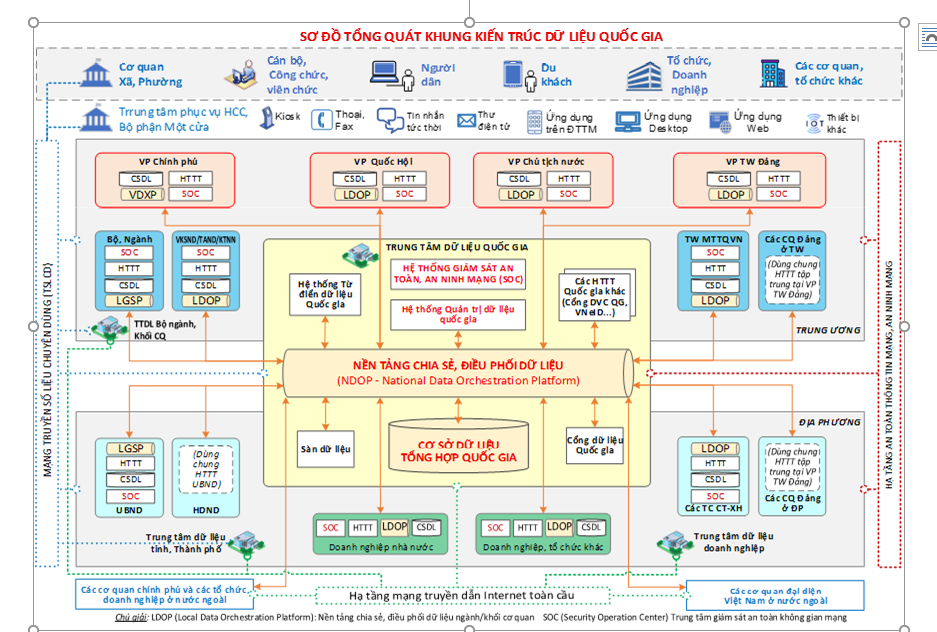 Sơ đồ tổng quát khung kiến trúc dữ liệu quốc gia bao gồm các thành phần sau: