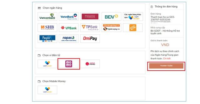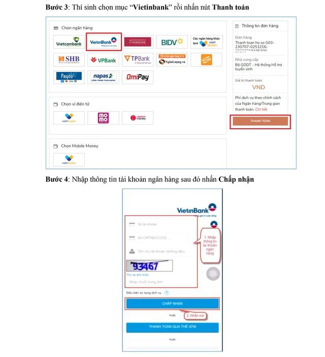 - Thí sinh có thể tự thanh toán bằng tài khoản ngân hàng/tài khoản ví điện tử của bản thân (nếu có) hoặc nhờ người thân, thầy/cô giáo thanh toán hộ trên giao diện thanh toán của thí sinh.