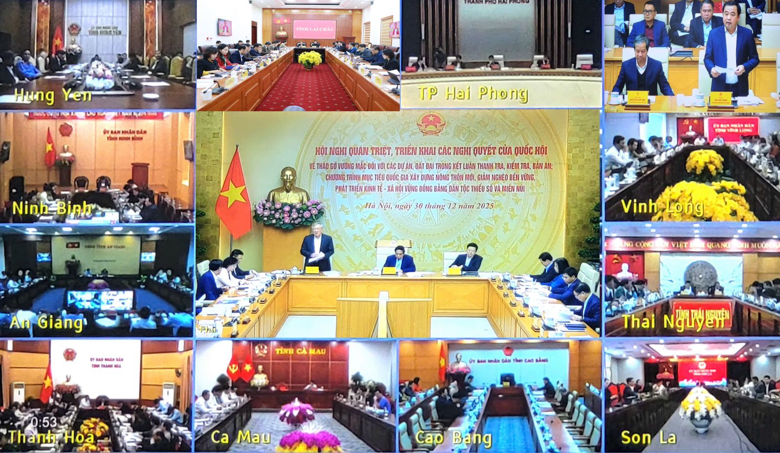 Sáng nay (30/12), Văn phòng Chính phủ tổ chức Hội nghị quán triệt, triển khai thực hiện các Nghị quyết của Quốc hội về mở rộng việc áp dụng Nghị quyết số 170/2024/QH15 để tháo gỡ vướng mắc đối với các dự án, đất đai trong kết luận thanh tra, kiểm tra, bản án; Chương trình mục tiêu quốc gia xây dựng nông thôn mới, giảm nghèo bền vững và phát triển kinh tế - xã hội vùng đồng bào dân tộc thiểu số và miền núi. Thủ tướng Chính phủ Phạm Minh Chính dự và phát biểu kết luận Hội nghị.