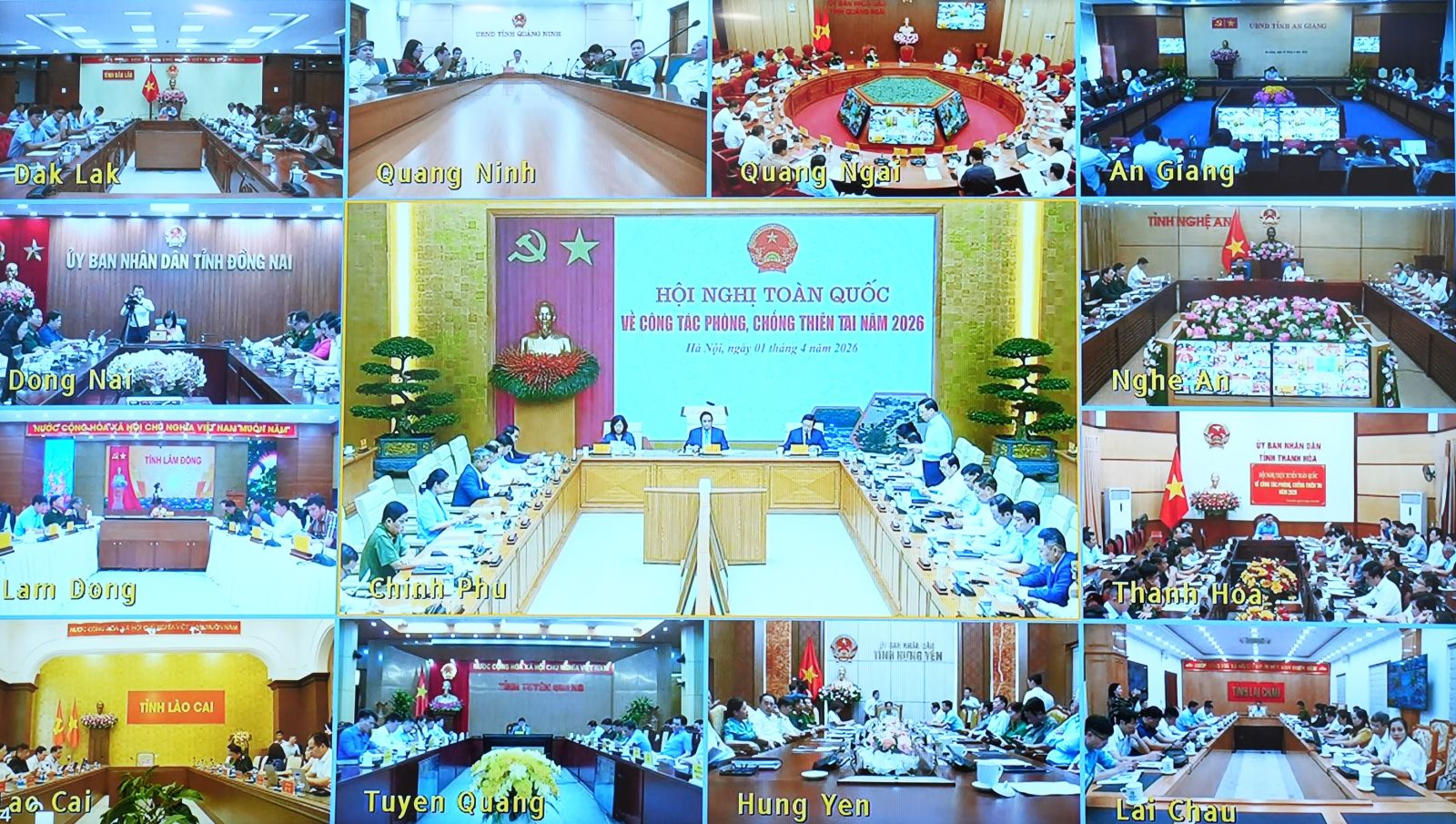 Chiều nay (1/4), Chính phủ tổ chức Hội nghị trực tiếp kết hợp trực tuyến từ điểm cầu Chính phủ đến điểm cầu các tỉnh, thành phố, xã, phường, đặc khu trong cả nước về công tác phòng, chống thiên tai năm 2026. Thủ tướng Chính phủ Phạm Minh Chính - Trưởng Ban Chỉ đạo Phòng thủ dân sự quốc gia; Chủ tịch Ủy ban Trung ương Mặt trận Tổ quốc Việt Nam Bùi Thị Minh Hoài; Phó Thủ tướng Trần Hồng Hà - Phó Ban Chỉ đạo Phòng thủ dân sự quốc gia đồng chủ trì Hội nghị.