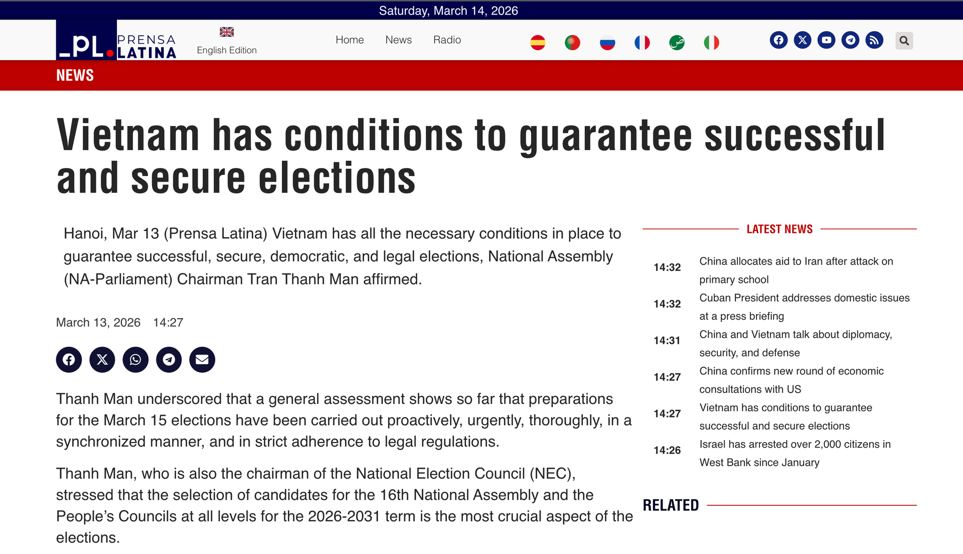 Prensa Latina cũng nhấn mạnh cơ cấu ứng cử viên phản ánh sự đại diện khá đa dạng của các tầng lớp xã hội, với tỷ lệ phụ nữ, người dân tộc thiểu số và ứng cử viên lần đầu tương đối cao. Theo hãng tin này, đây là một trong những điểm đáng chú ý của cuộc bầu cử, cho thấy xu hướng tăng cường tính đại diện trong các cơ quan dân cử của Việt Nam.