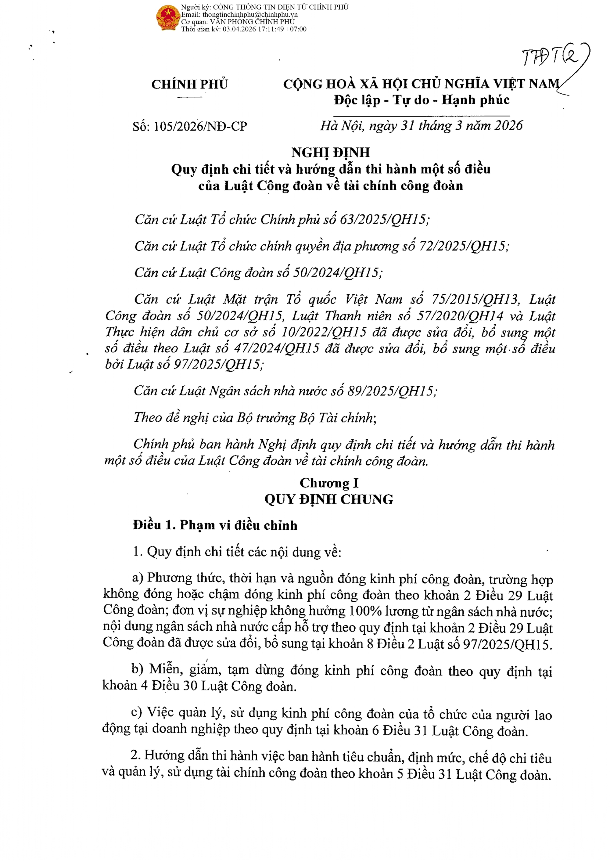 TOÀN VĂN: Nghị định 105/2026/NĐ-CP về quy định, hướng dẫn thi hành tài chính công đoàn