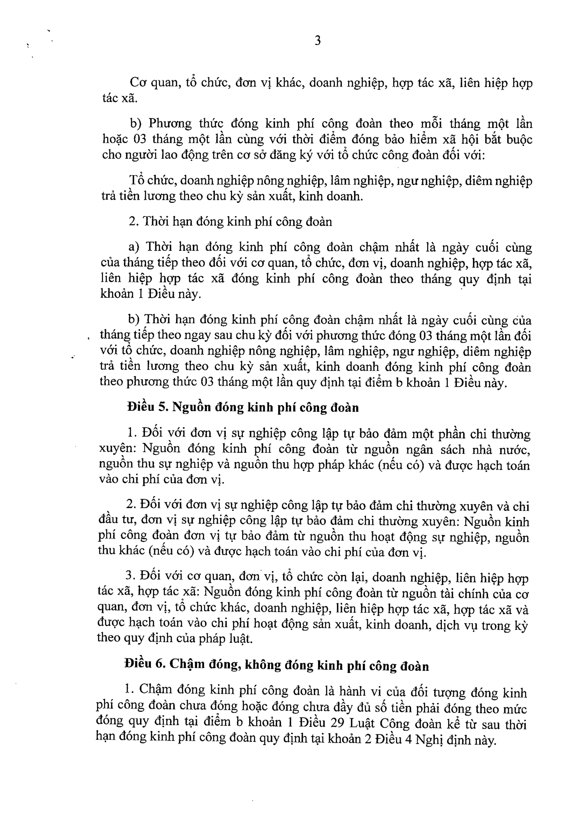 3. Đối với cơ quan, đơn vị, tổ chức còn lại, doanh nghiệp, liên hiệp hợp tác xã, hợp tác xã: Nguồn đóng kinh phí công đoàn từ nguồn tài chính của cơ quan, đơn vị, tổ chức khác, doanh nghiệp, liên hiệp hợp tác xã, hợp tác xã và được hạch toán vào chi phí hoạt động sản xuất, kinh doanh, dịch vụ trong kỳ theo quy định của pháp luật.