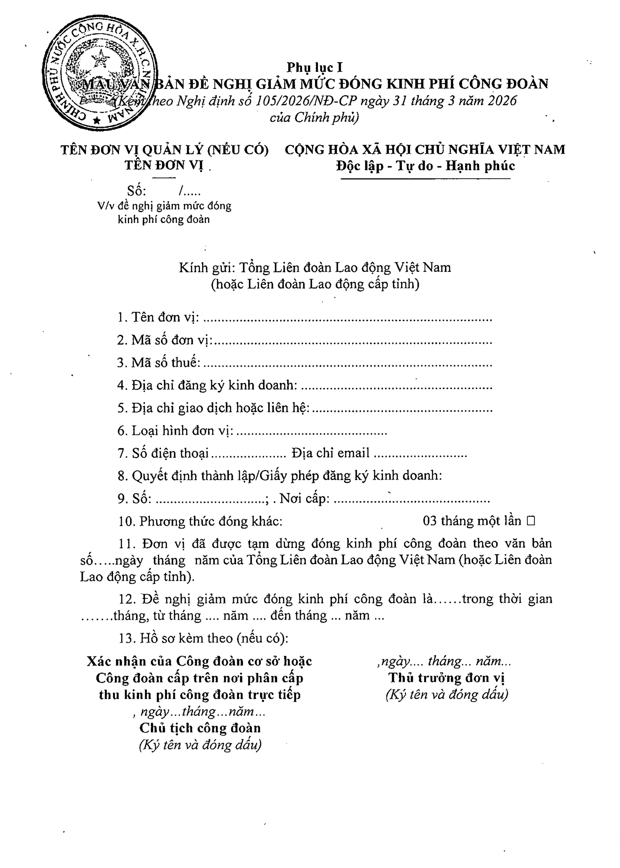 Toàn văn Nghị định 105/2026/NĐ-CP Quy định chi tiết và hướng dẫn thi hành một số điều của Luật Công đoàn về tài chính công đoàn. Nghị định này có hiệu lực từ 16/5/2026.