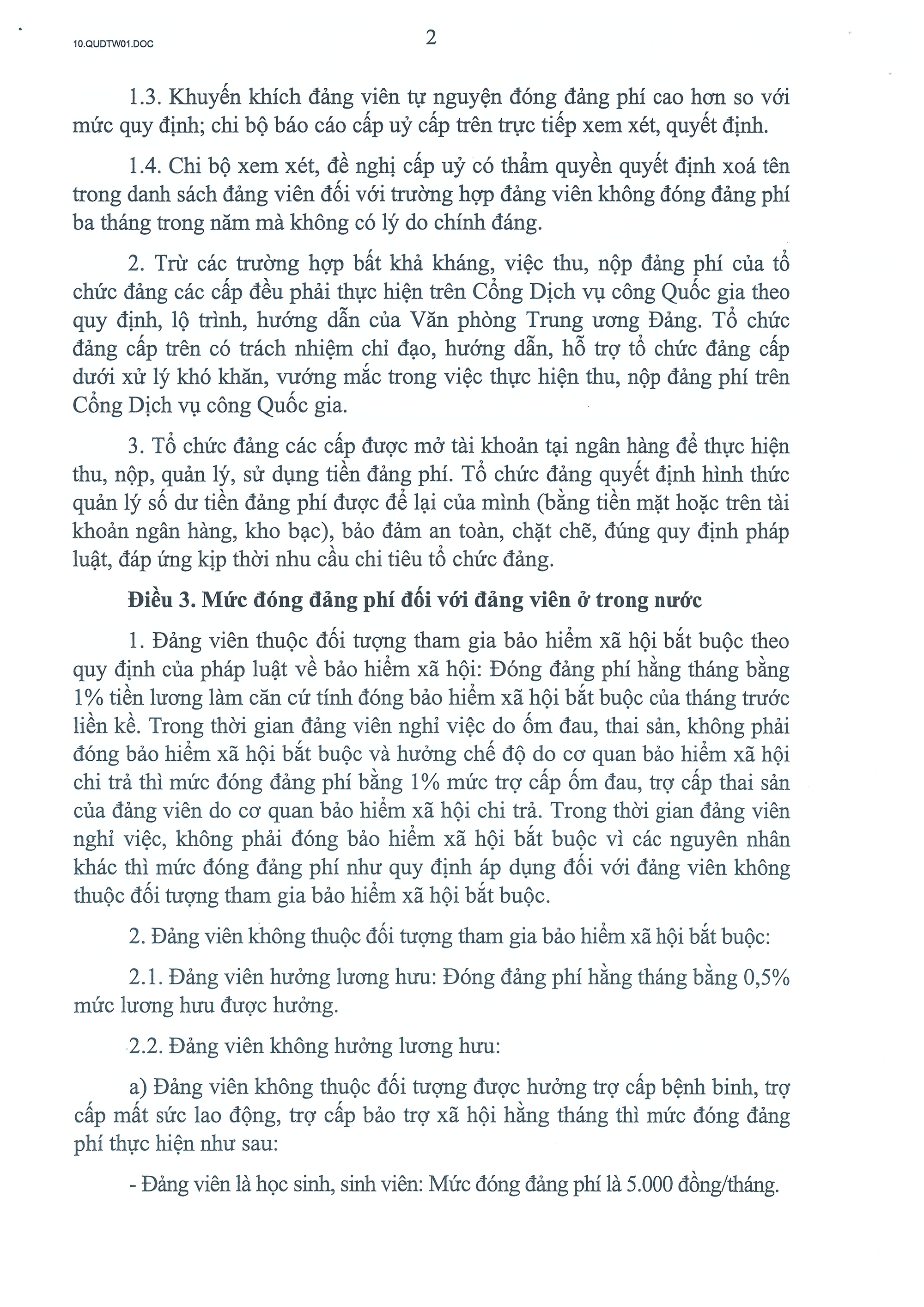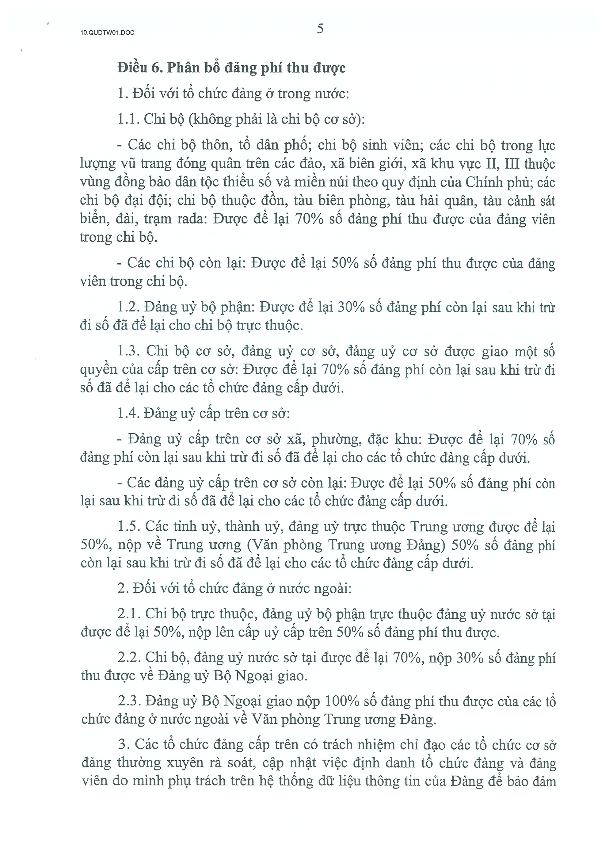 Quy định số 01-QĐ/TW quy định về việc đóng đảng phí của đảng viên; nguyên tắc thu, nộp, phân bổ và quản lý, sử dụng đảng phí của tổ chức đảng các cấp.