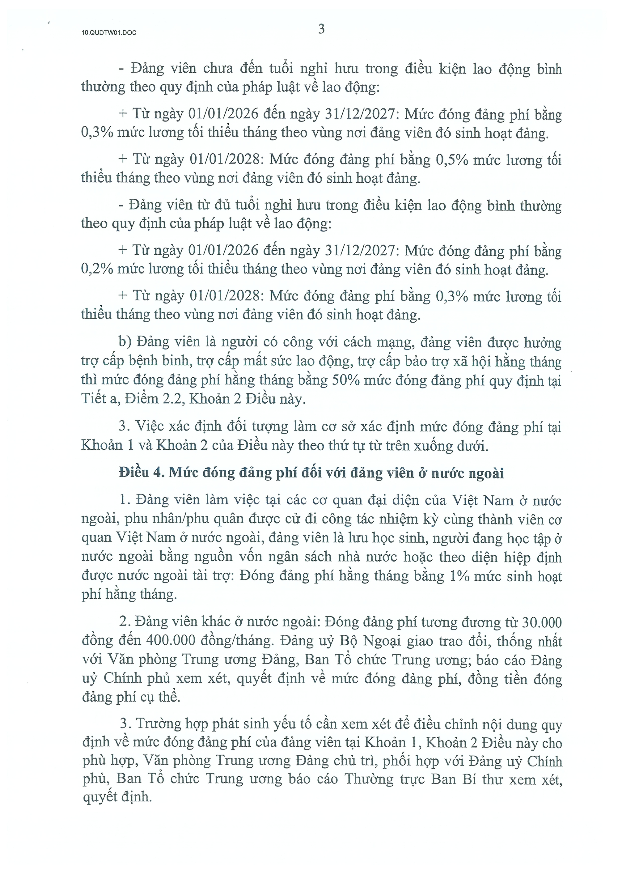 3. Trường hợp phát sinh yếu tố cần xem xét để điều chỉnh nội dung quy định về mức đóng đảng phí của đảng viên tại Khoản 1, Khoản 2 Điều này cho phù hợp, Văn phòng Trung ương Đảng chủ trì, phối hợp với Đảng ủy Chính phủ, Ban Tổ chức Trung ương báo cáo Thường trực Ban Bí thư xem xét, quyết định".