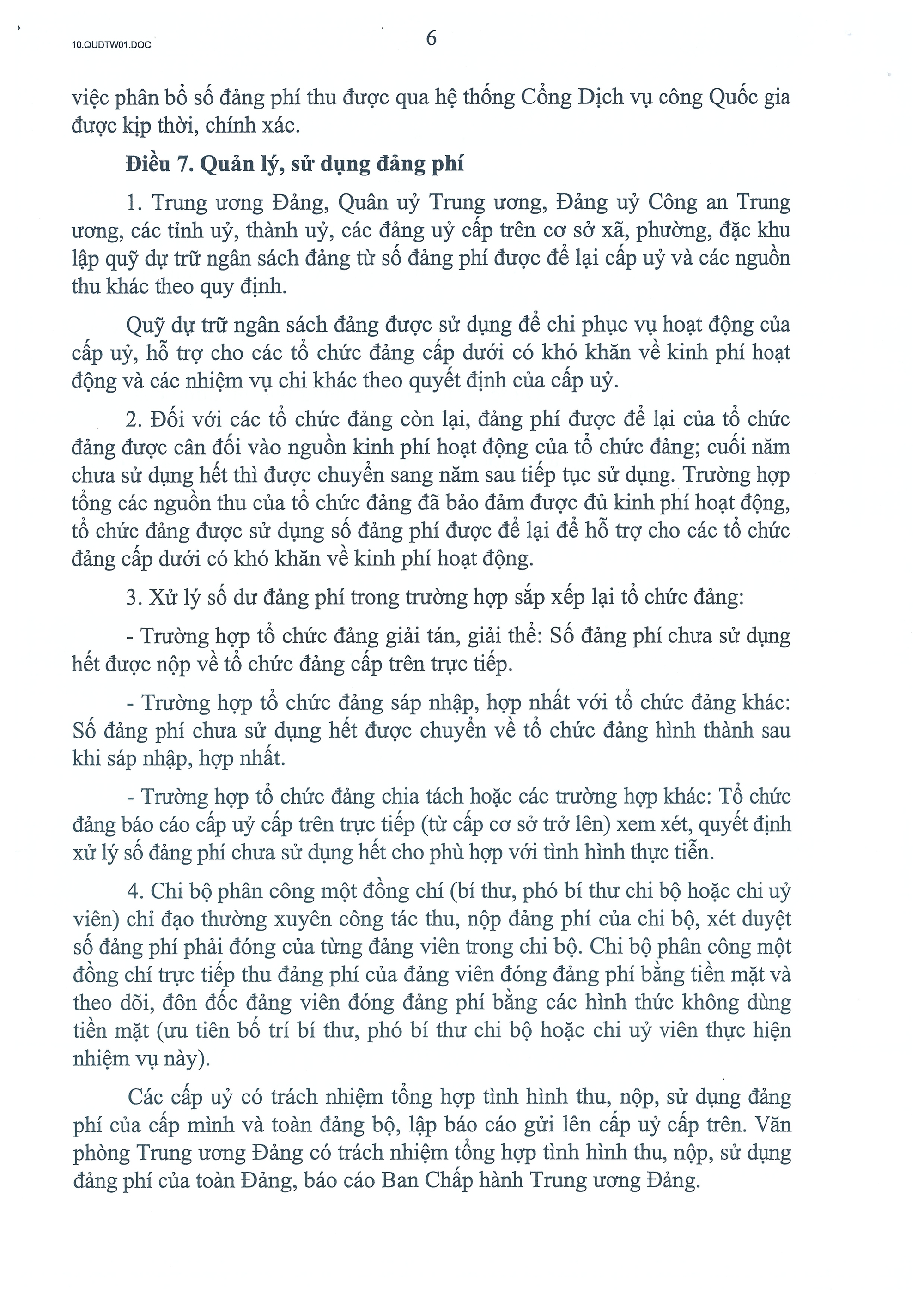 Quy định số 01-QĐ/TW cũng quy định về: Phân bổ đảng phí thu được (Điều 6); Quản lý, sử dụng đảng phí (Điều 7).