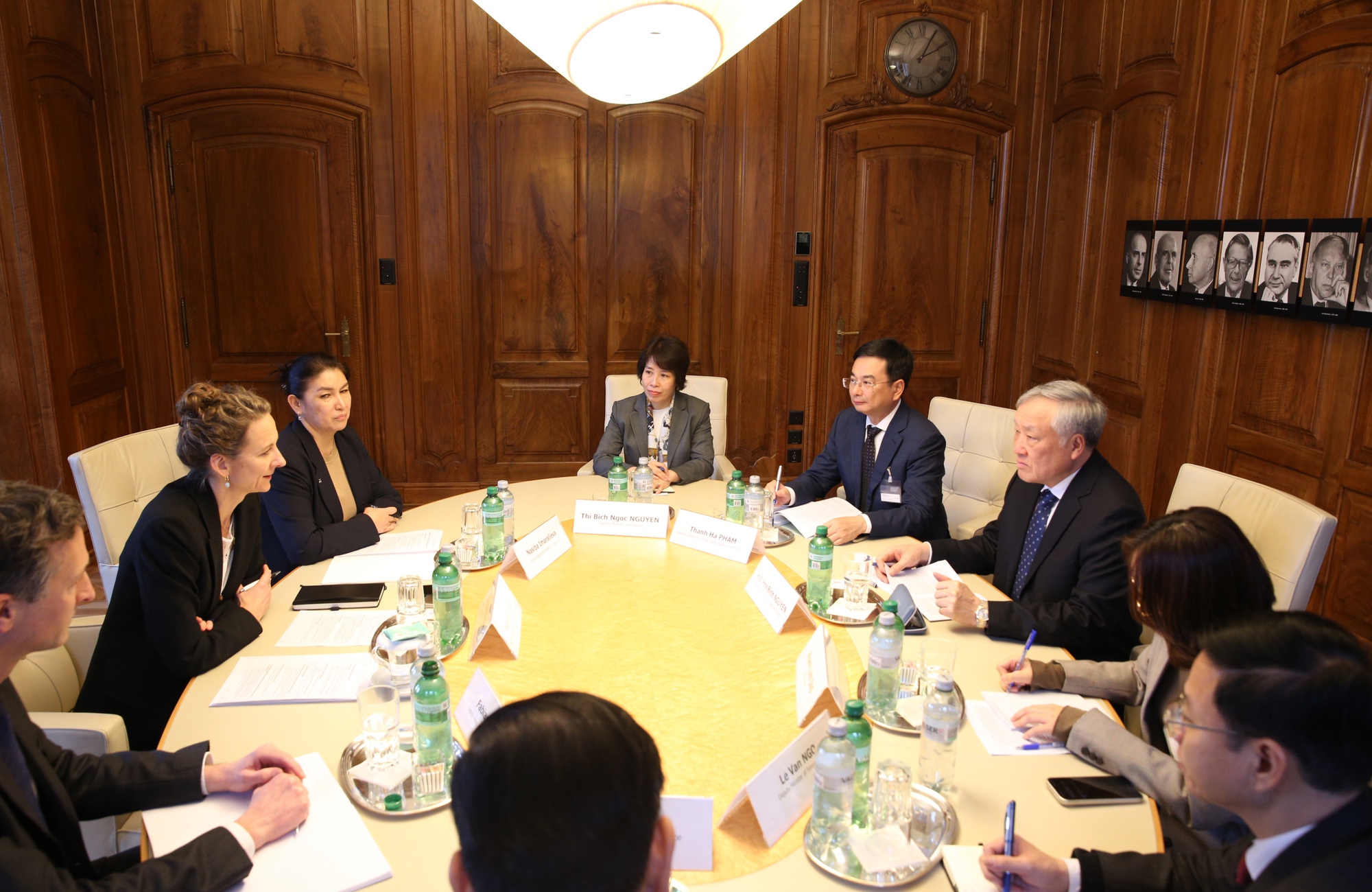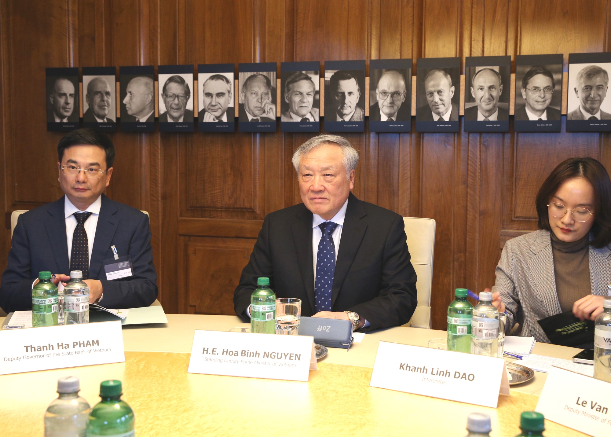 Trong khuôn khổ chuyến thăm làm việc tại Thụy Sĩ, chiều 29/1 (giờ địa phương), Phó Thủ tướng Thường trực Chính phủ Nguyễn Hoà Bình đã có các cuộc làm việc với lãnh đạo Ngân hàng Trung ương Thụy Sĩ, lãnh đạo Ngân hàng tài sản số Sygnum, lãnh đạo và các thành viên Liên đoàn Doanh nghiệp Thụy Sĩ.