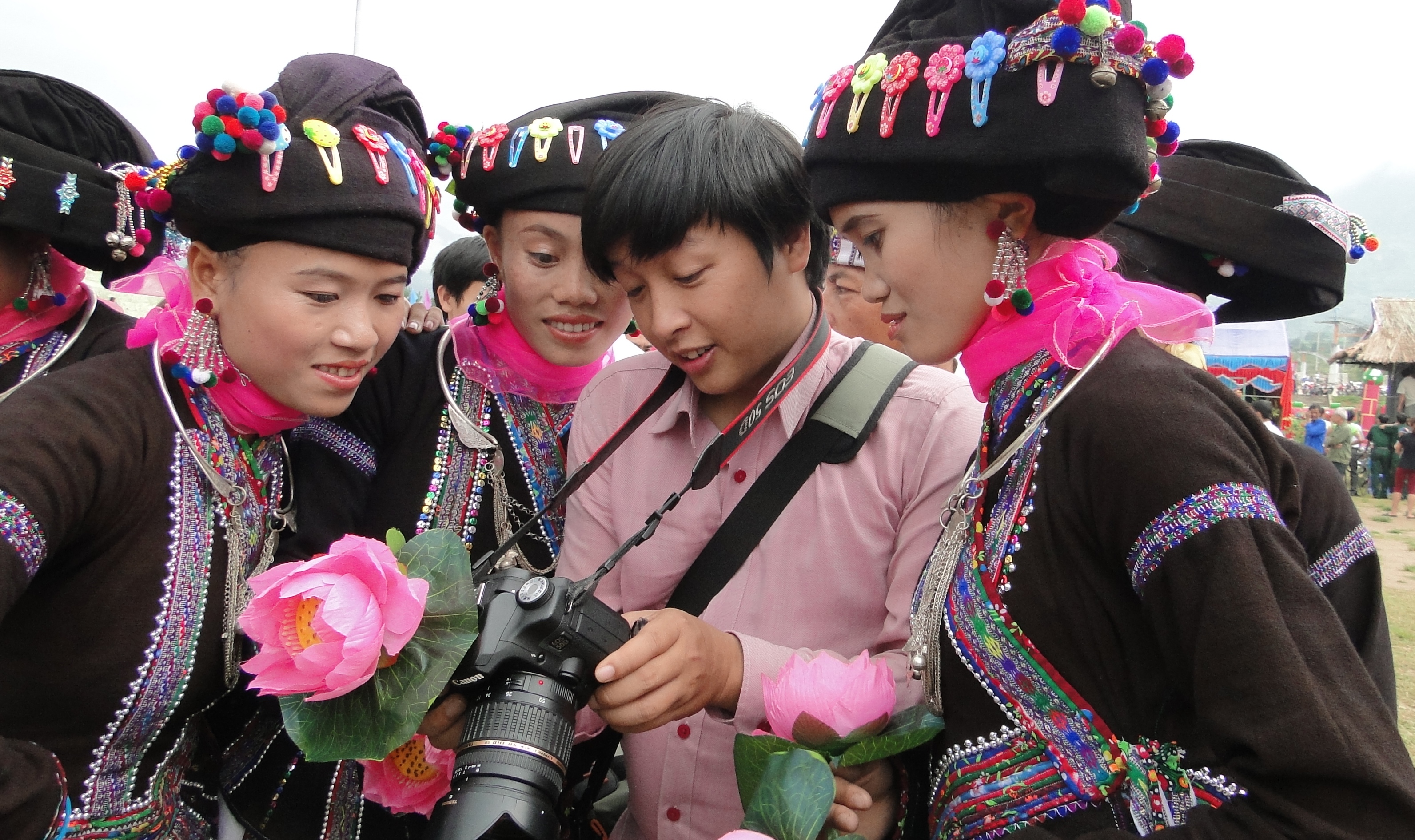 những sơn nữ thích thú xem lại hình ảnh của mình vừa chụp...