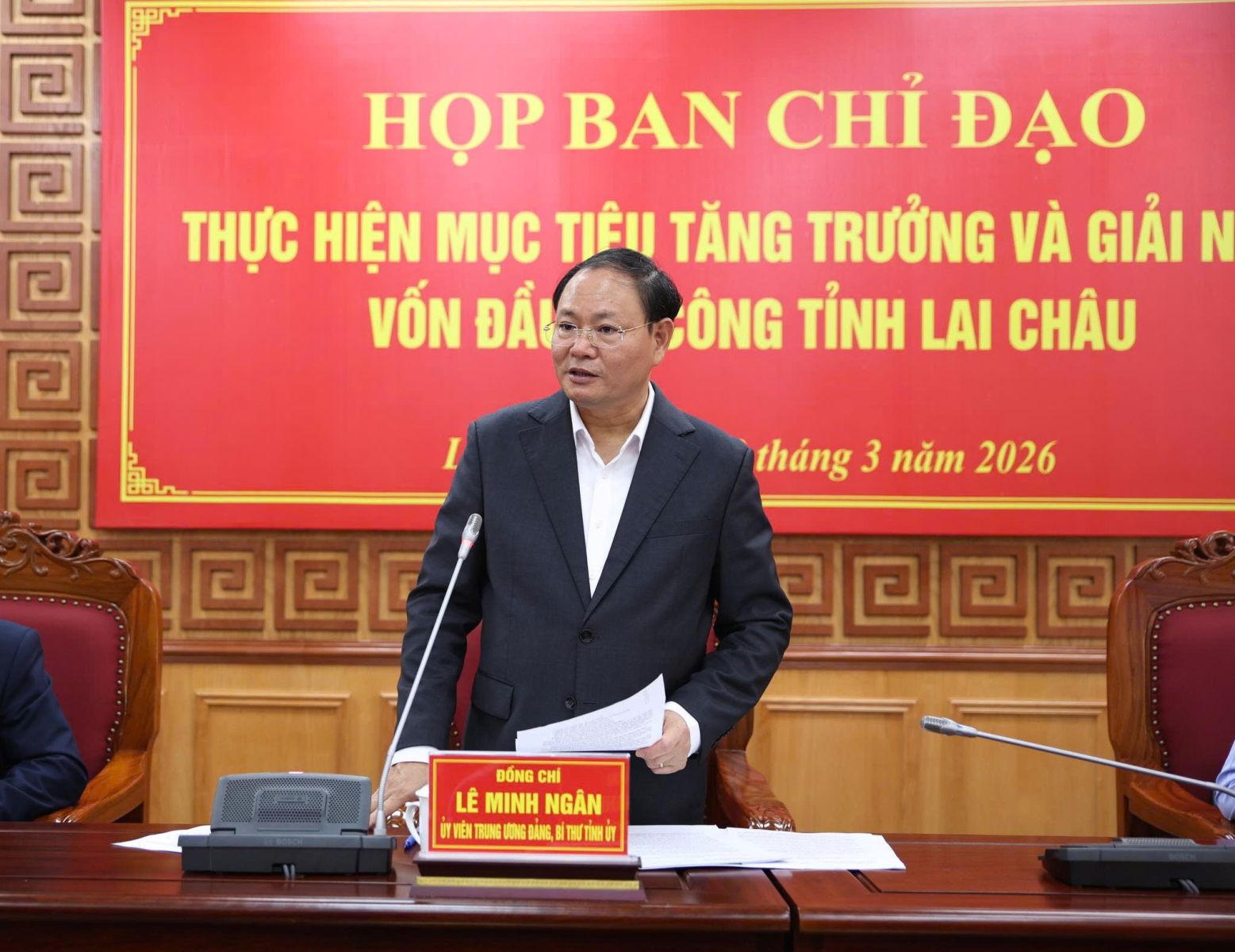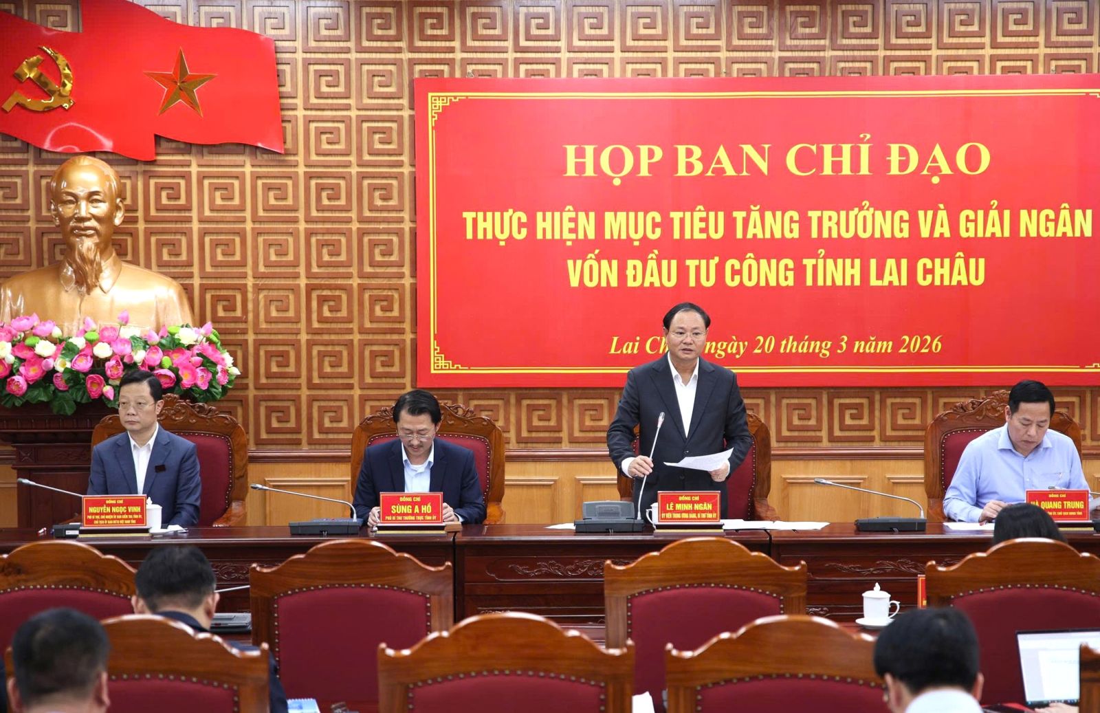 Sáng nay (20/3), Ban Chỉ đạo thực hiện mục tiêu tăng trưởng và giải ngân vốn đầu tư công tỉnh Lai Châu họp để thông qua quy chế hoạt động và cho ý kiến vào báo cáo tình hình thực hiện mục tiêu tăng trưởng và giải ngân vốn đầu tư công Quý I năm 2026. Đồng chí Lê Minh Ngân - Ủy viên Ban Chấp hành Trung ương Đảng, Bí thư Tỉnh ủy, Trưởng Ban Chỉ đạo chủ trì cuộc họp.