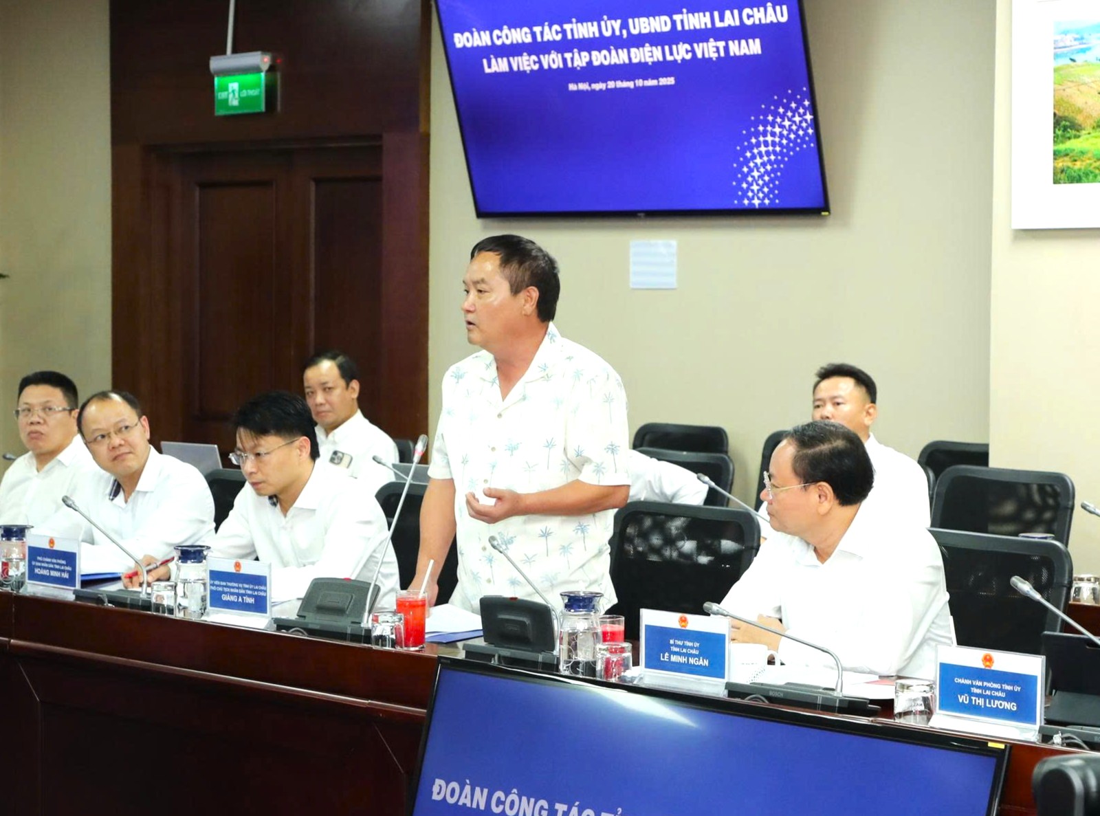 Tại buổi làm việc, UBND tỉnh đề nghị Tập đoàn Điện lực Việt Nam tập trung đẩy nhanh tiến độ các dự án truyền tải điện trên địa bàn như: Trạm biến áp 500kV Lai Châu, trạm 220kV Mường Tè, Than Uyên, Phong Thổ, Pắc Ma, và các đường dây 220kV kết nối giữa các khu vực, nhằm đảm bảo giải tỏa công suất các nguồn điện mới. Đồng thời, đề nghị Tập đoàn Điện lực Việt Nam chỉ đạo các Ban quản lý dự án điện rà soát, điều chỉnh quy hoạch các dự án điện mặt trời nổi để tránh chồng chéo, bảo đảm hiệu quả sử dụng đất, mặt nước và phù hợp với quy hoạch phát triển của tỉnh.