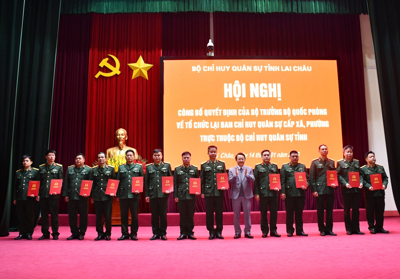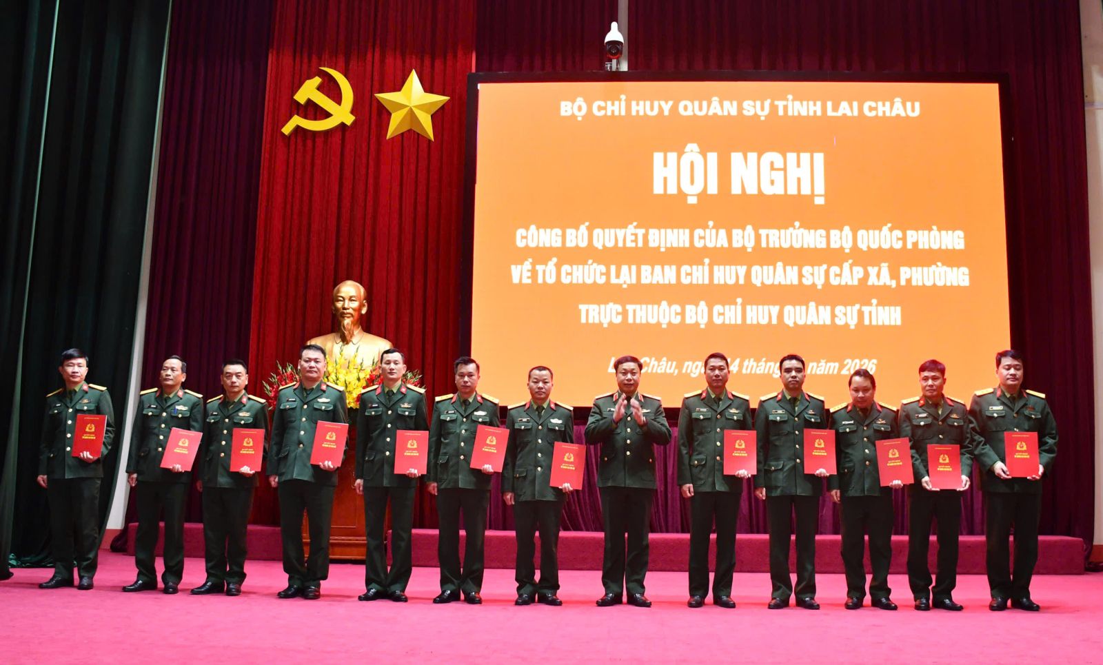 Tại Hội nghị, lãnh đạo Bộ CHQS tỉnh đã công bố quyết định của Bộ trưởng Bộ Quốc phòng về việc tổ chức lại Ban CHQS cấp xã, phường; Quyết định của Tổng Tham mưu trưởng Quân đội Nhân dân Việt Nam về việc ban hành biểu tổ chức, biên chế của Ban CHQS xã, phường, đặc khu; công bố và trao Quyết định của Bộ Tư lệnh Quân khu 2 về việc bổ nhiệm có thời hạn đối với 38 cán bộ giữ chức Chỉ huy trưởng Ban CHQS các xã, phường trên địa bàn tỉnh Lai Châu.